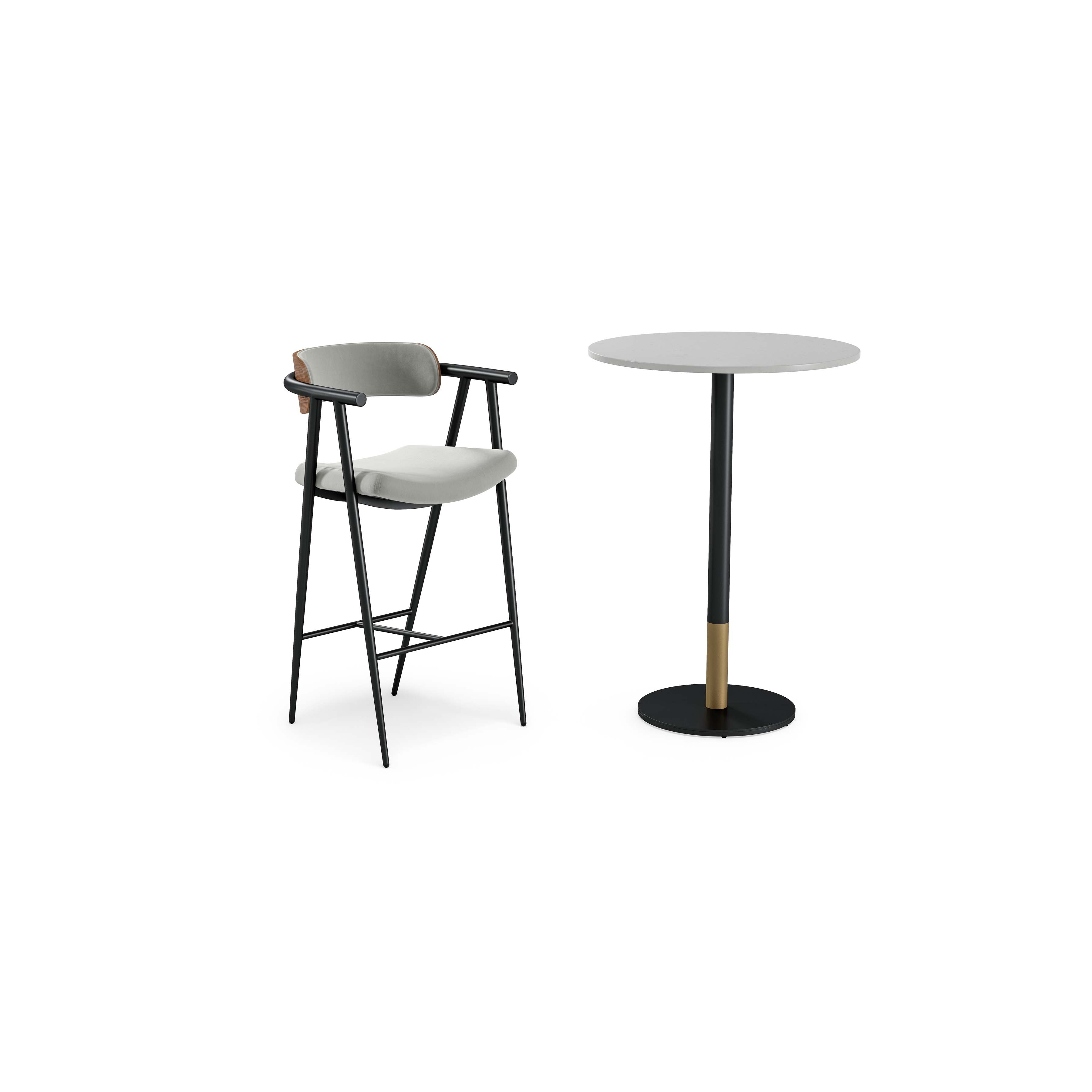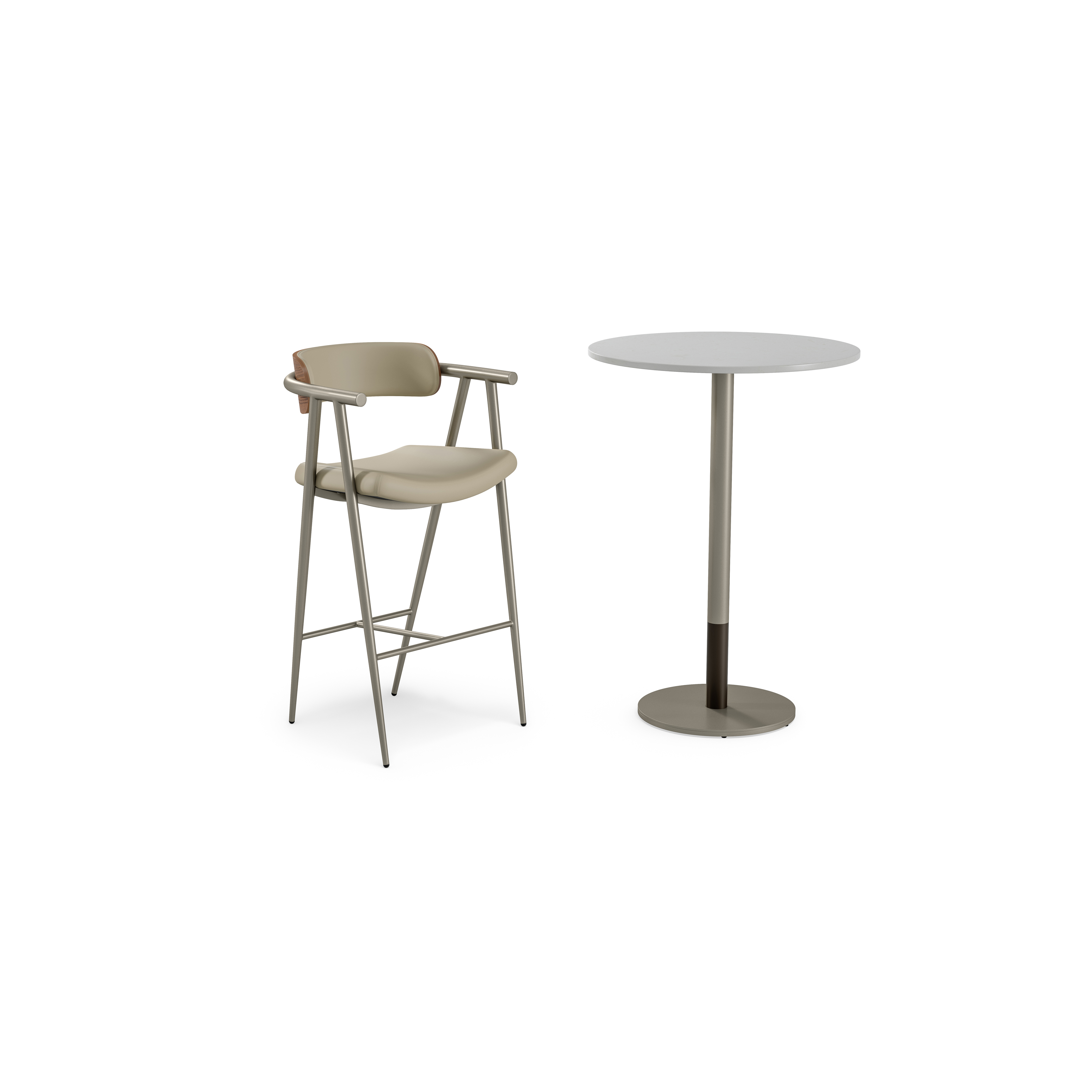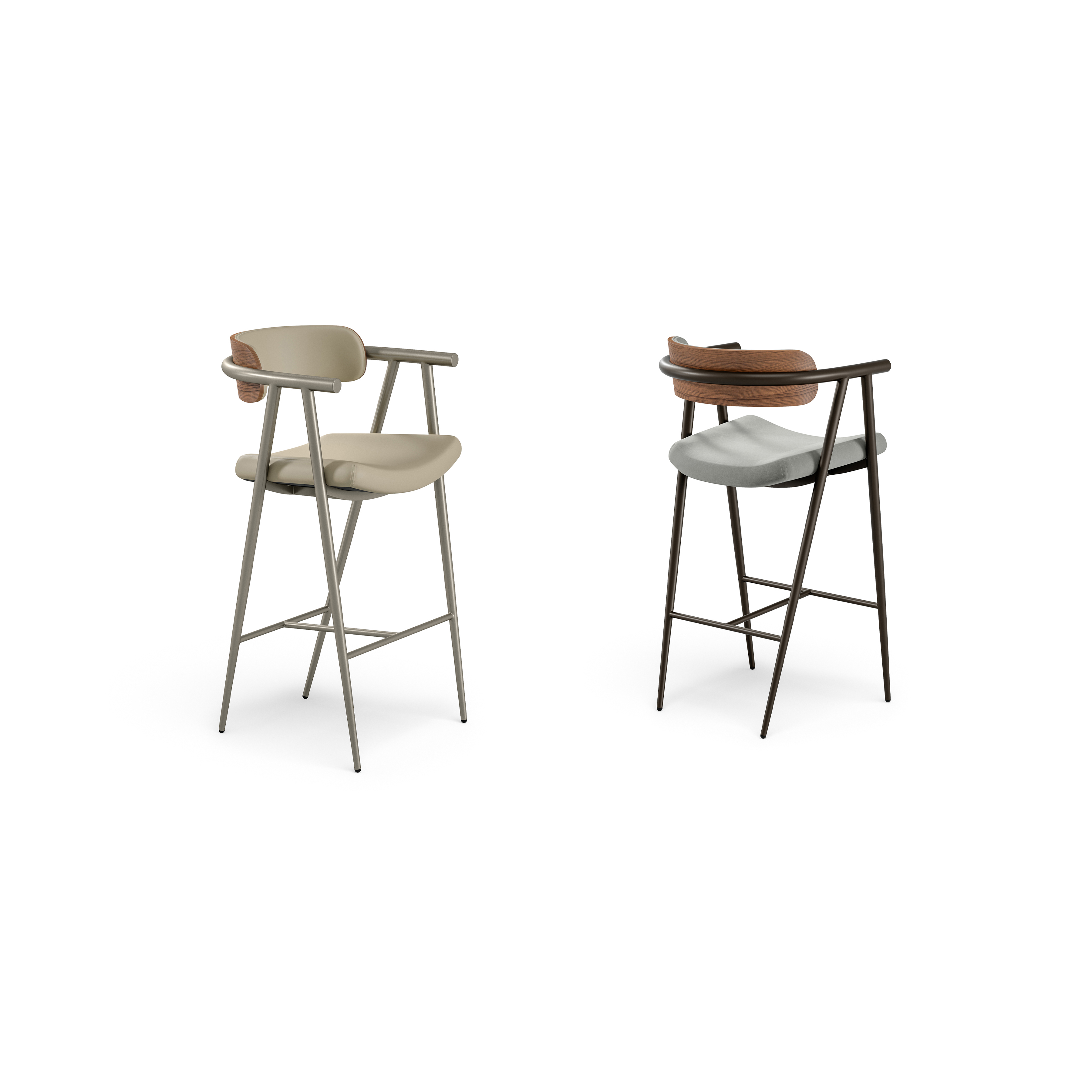 The Brody barstool features a strong foundation of angled tubular steel legs that provide support for a plush seat cushion. This cushion is thoughtfully curved for comfort, providing hours of enjoyment. The back is crafted of walnut veneer over an arched panel. This back wraps around for support and style.