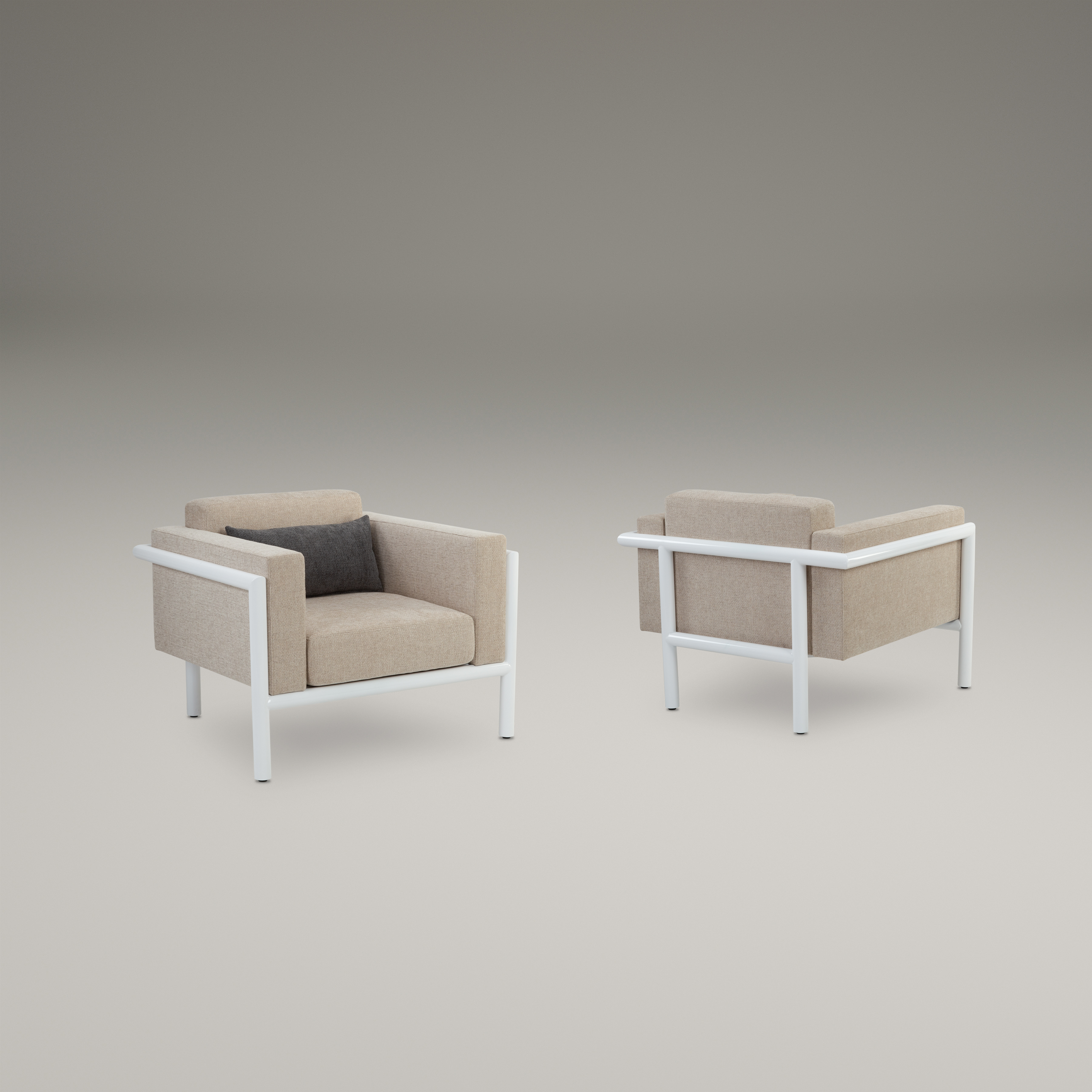 Canyon offers an external metal tubular frame that can be customized in the color of your choice. Thick foam seats and backs are enclosed with a modern track arm, and throw pillows are included.