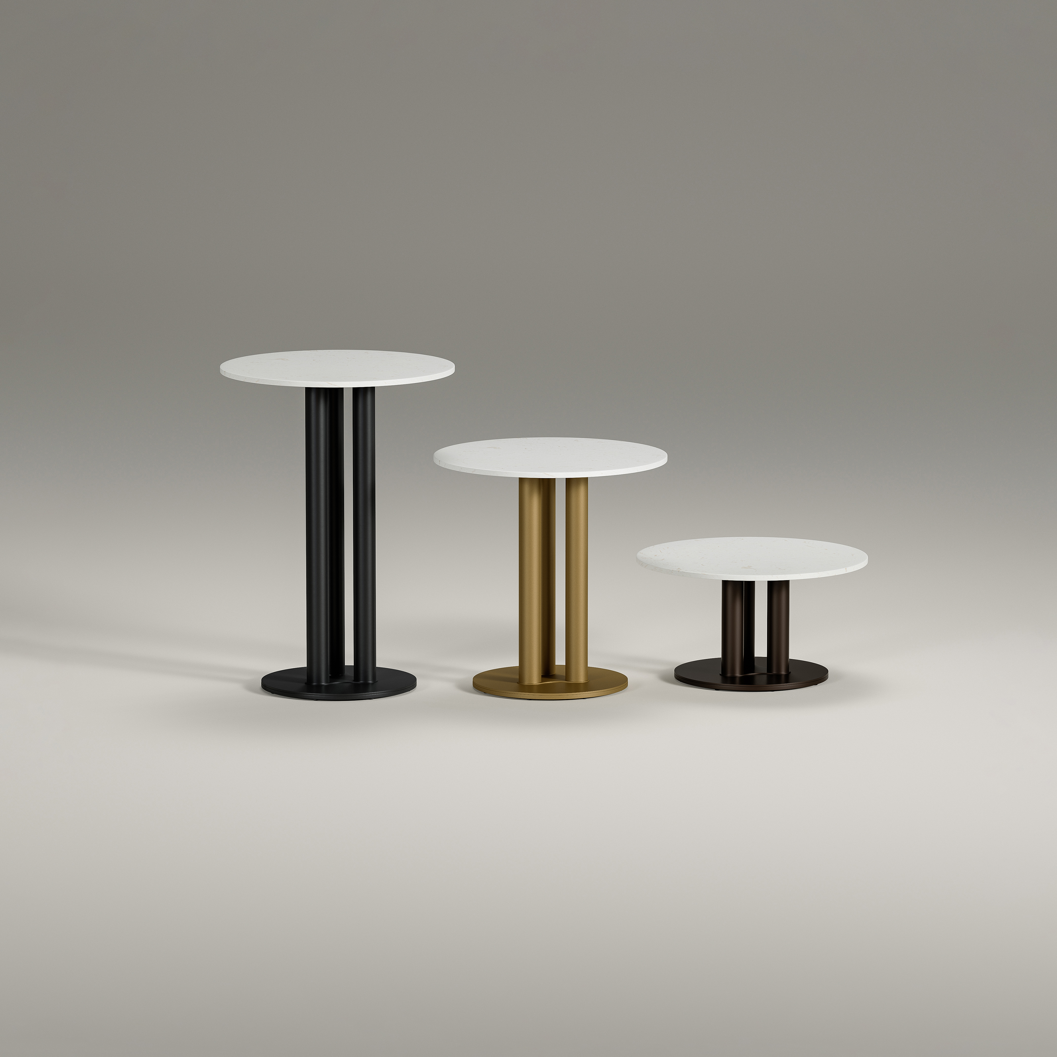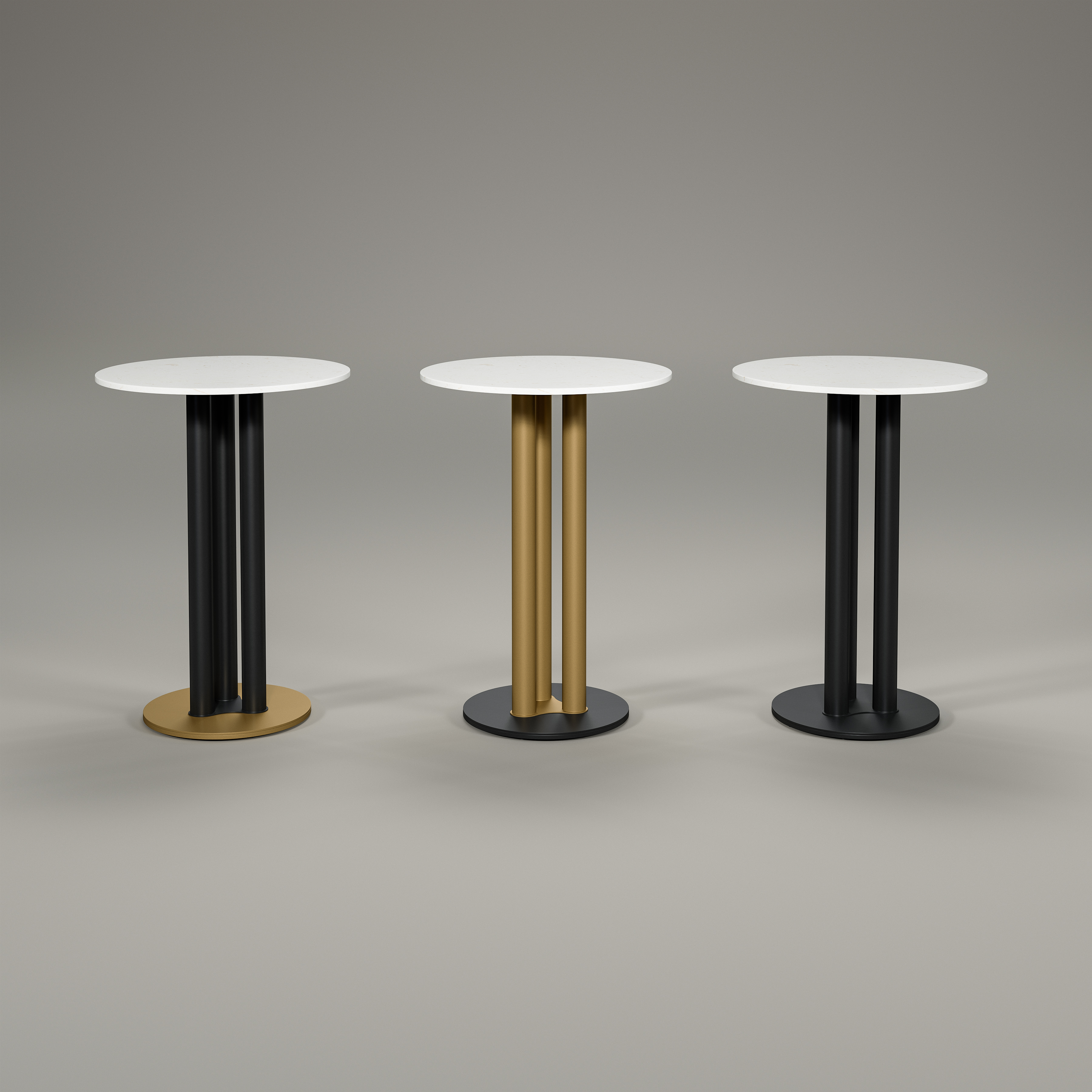 Trilogy is crafted with three sleek metal columns rising from a circular base plate. A cultured stone surface sits atop the columns with effortless grace. But that's not all - the simple modern style can be fully customized to fit your unique lifestyle, with a variety of metal finish colors to choose from.