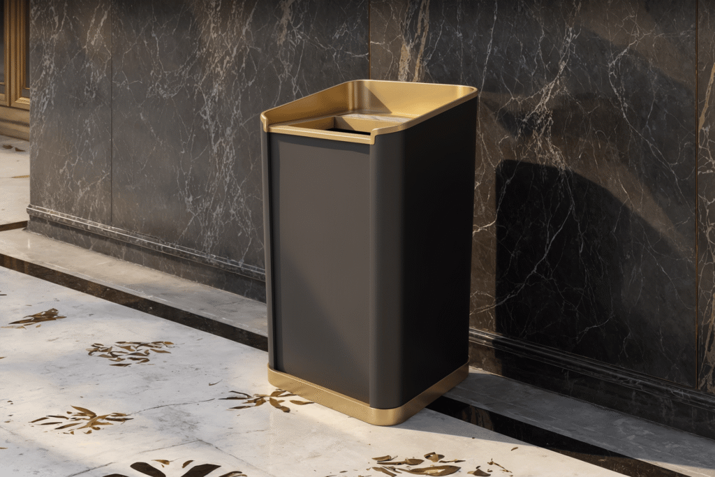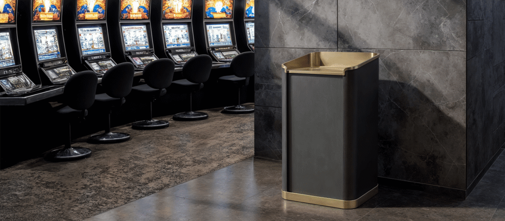Portola has been Designed to accommodate both trash and ash disposal needs, it offers an elevated solution that meets the demands of luxury while upholding cleanliness and efficiency in dynamic public spaces. The clean, geometric lines, paired with rounded edges, deliver a contemporary aesthetic that aligns with the polished atmosphere of exclusive gaming floors, VIP lounges, and high-stakes poker rooms. The dual-compartment design discreetly separates trash and ash disposal, ensuring an organized approach to waste management while maintaining the receptacle's streamlined and uncluttered appearance. By harmonizing practicality with an elegant design, Portola reflects the sophistication and attention to detail that define a world-class casino experience. Its presence enhances the ambiance of luxury and exclusivity, making it an indispensable feature for maintaining the high standards of premier establishments.