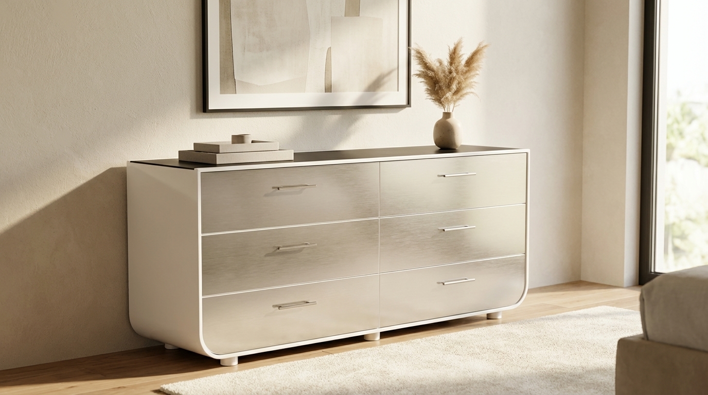 Penthouse worthy and unsurpassed luxury intersect to define the André dresser! Linear lines of powder-coated contoured steel combine with a thick tempered acid-etched glass top and sophisticated shimmering brushed stainless steel drawer fronts, to add a dramatic touch to your bedroom environment. Each drawer features heavy-duty runners with a self-closing mechanism. Available in a sable or caviar black tempered glass top and all of Elite’s various powder-coat finishes.