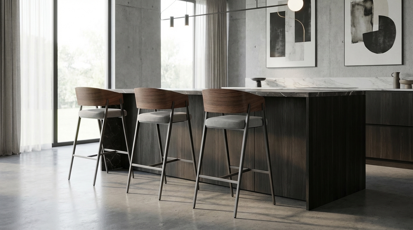 The Aria stool is a study in contrasts— plush upholstery plays against the rich walnut veneer of the surrounding shell. Gracefully splayed, almost delicate steel legs support an abundant wraparound back. Soft/hard, heavy/light— all fine-tuned like a masterful piece of music. Complete the composition by selecting from any Elite powder-coat and wood finish. All stools feature polished chrome footrests for sparkle and durability, and the hydraulic stool easily adjusts from counter to bar height. Aria stools will easily harmonize with any of our popular bars and pub tables. Companion dining and accent chairs also available.