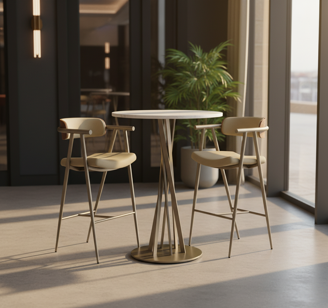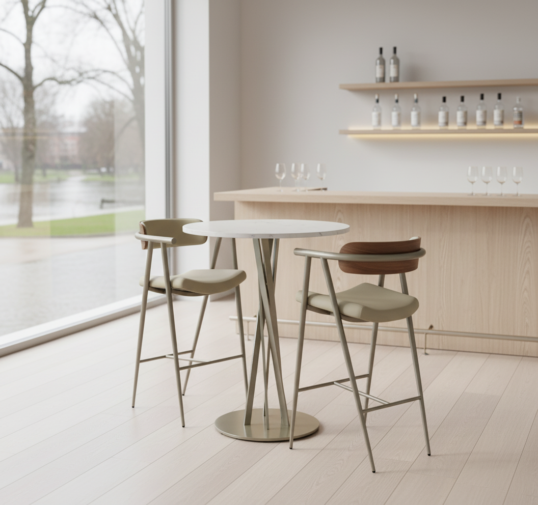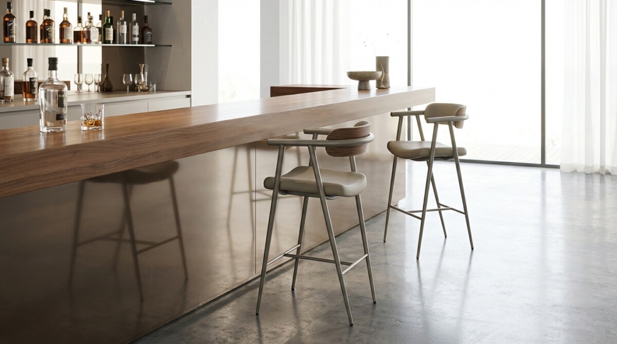 The Brody barstool features a strong foundation of angled tubular steel legs that provide support for a plush seat cushion. This cushion is thoughtfully curved for comfort, providing hours of enjoyment. The back is crafted of walnut veneer over an arched panel. This back wraps around for support and style.