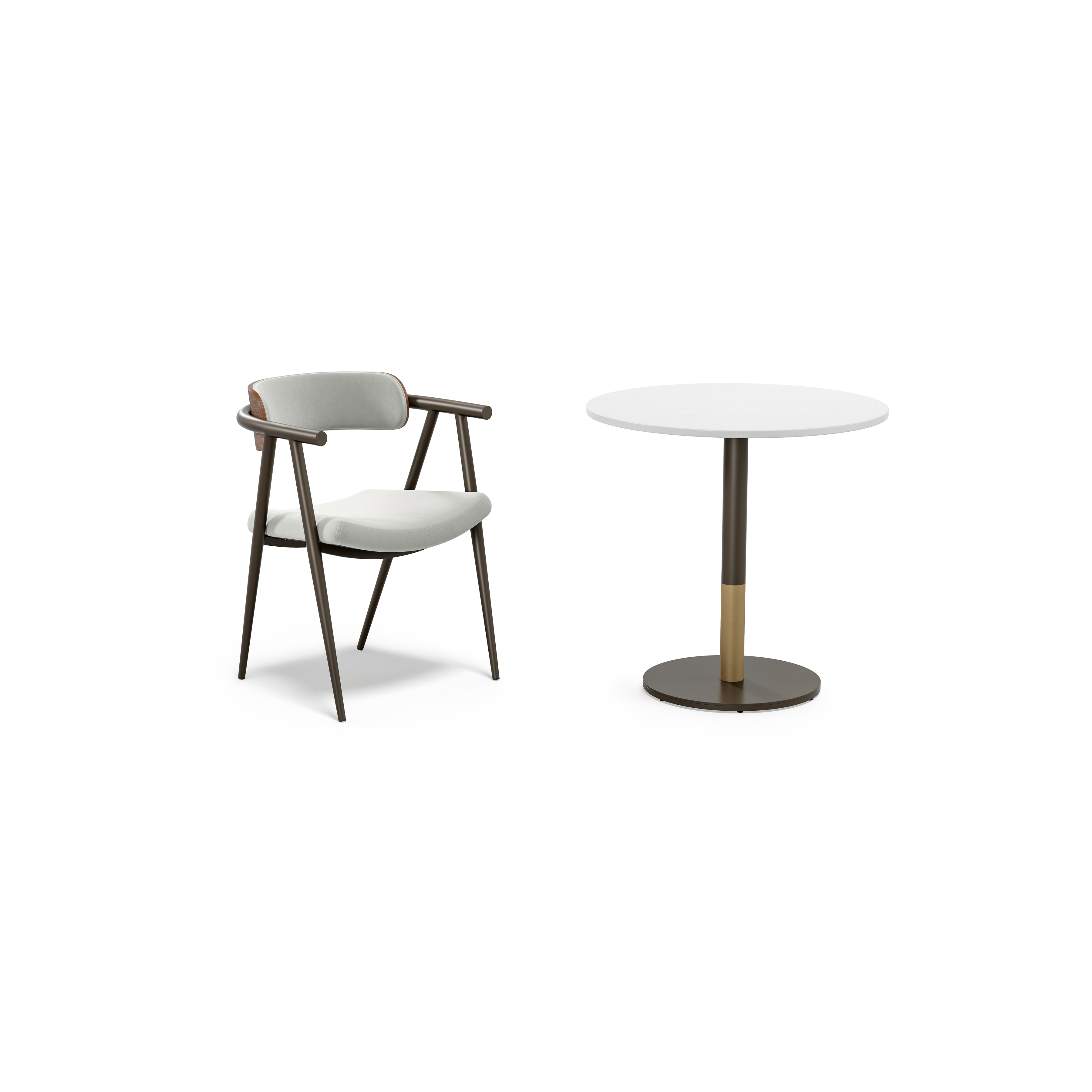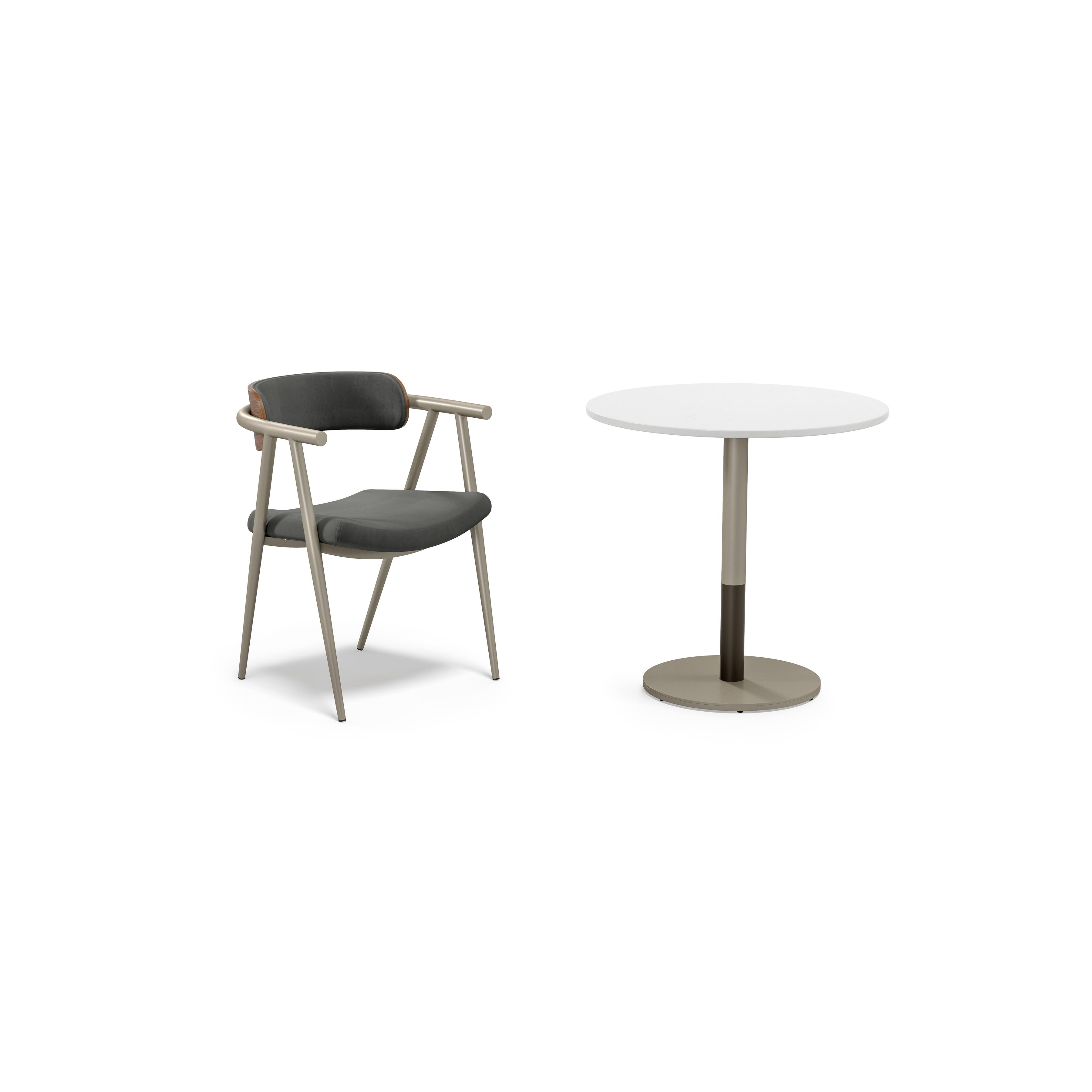 The Brody chair features a strong foundation of angled tubular steel legs that provide support for a plush seat cushion. This cushion is thoughtfully curved for comfort, providing hours of enjoyment. The back is crafted of walnut veneer over an arched panel. This back wraps around for support and style.