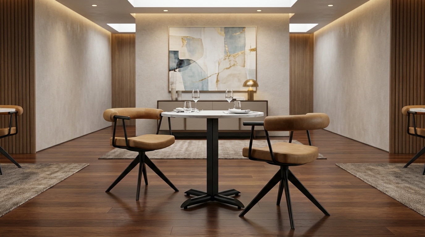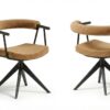 The Bruso swivel dining chair introduces an elevated sense of modern luxury to any sophisticated interior. Crafted with meticulous attention to detail, its distinctive form features a gracefully curved back and armrest, upholstered for both exceptional comfort and enduring style. The base features a memory swivel that can be rotated any direction 360 degrees and still return to face forward.