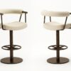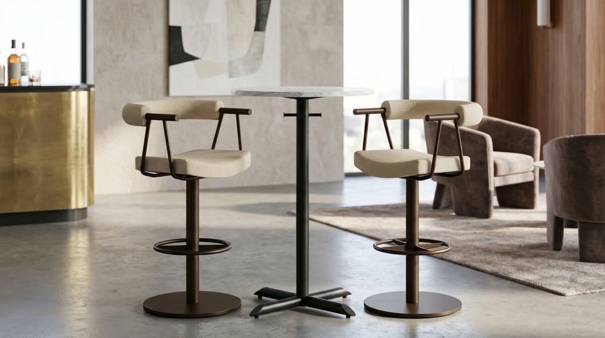 The Bruso swivel barstool epitomizes contemporary sophistication, blending industrial strength with refined comfort. Its architectural silhouette features a continuous upholstered backrest that curves gracefully into integrated armrests, supported by a minimalist metal frame constructed from robust round tubing. The generous seat rests atop a sturdy central pedestal base, finished in a sleek powder coat. Designed for both style and functionality, the integrated circular footrest provides ergonomic support, while the smooth return swivel mechanism ensures effortless movement. Perfect for upscale bars or modern kitchen islands, the Bruso is a testament to timeless design and superior craftsmanship.