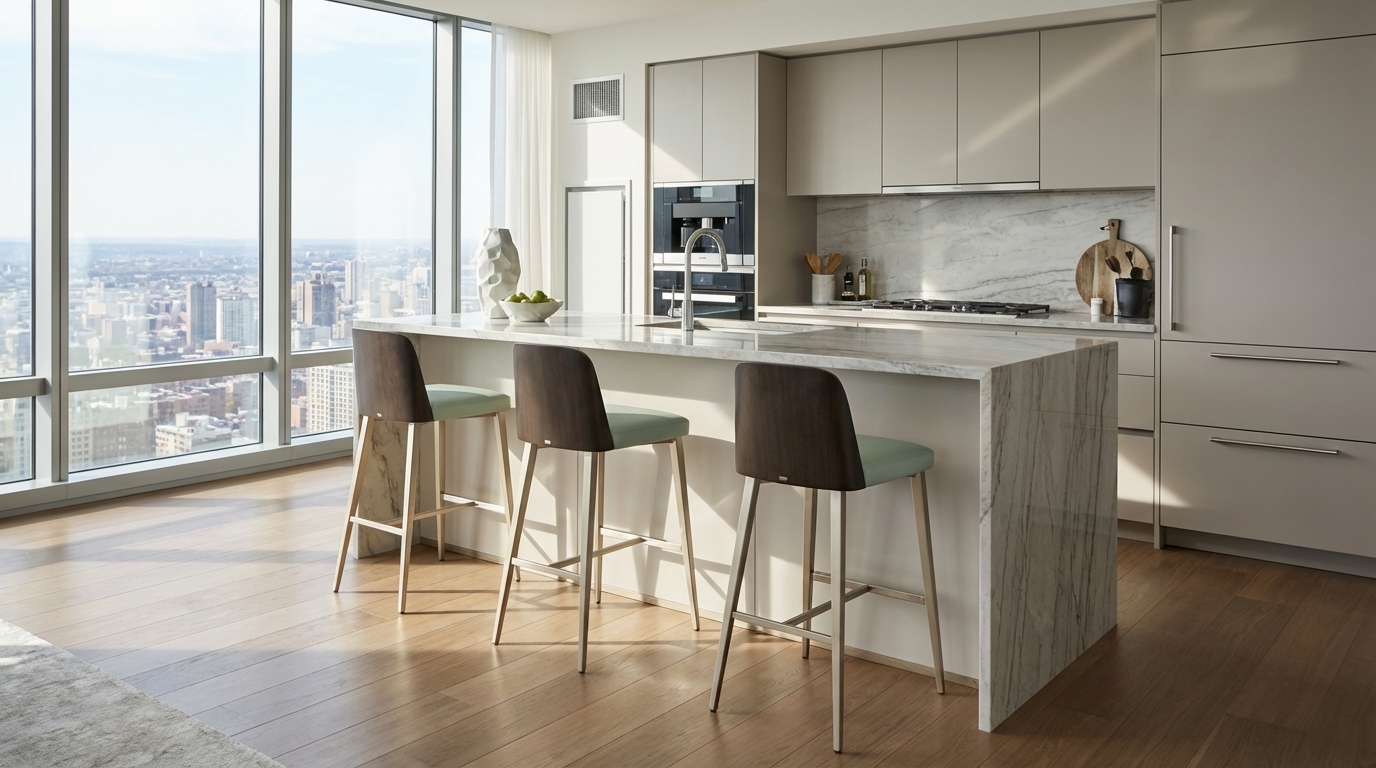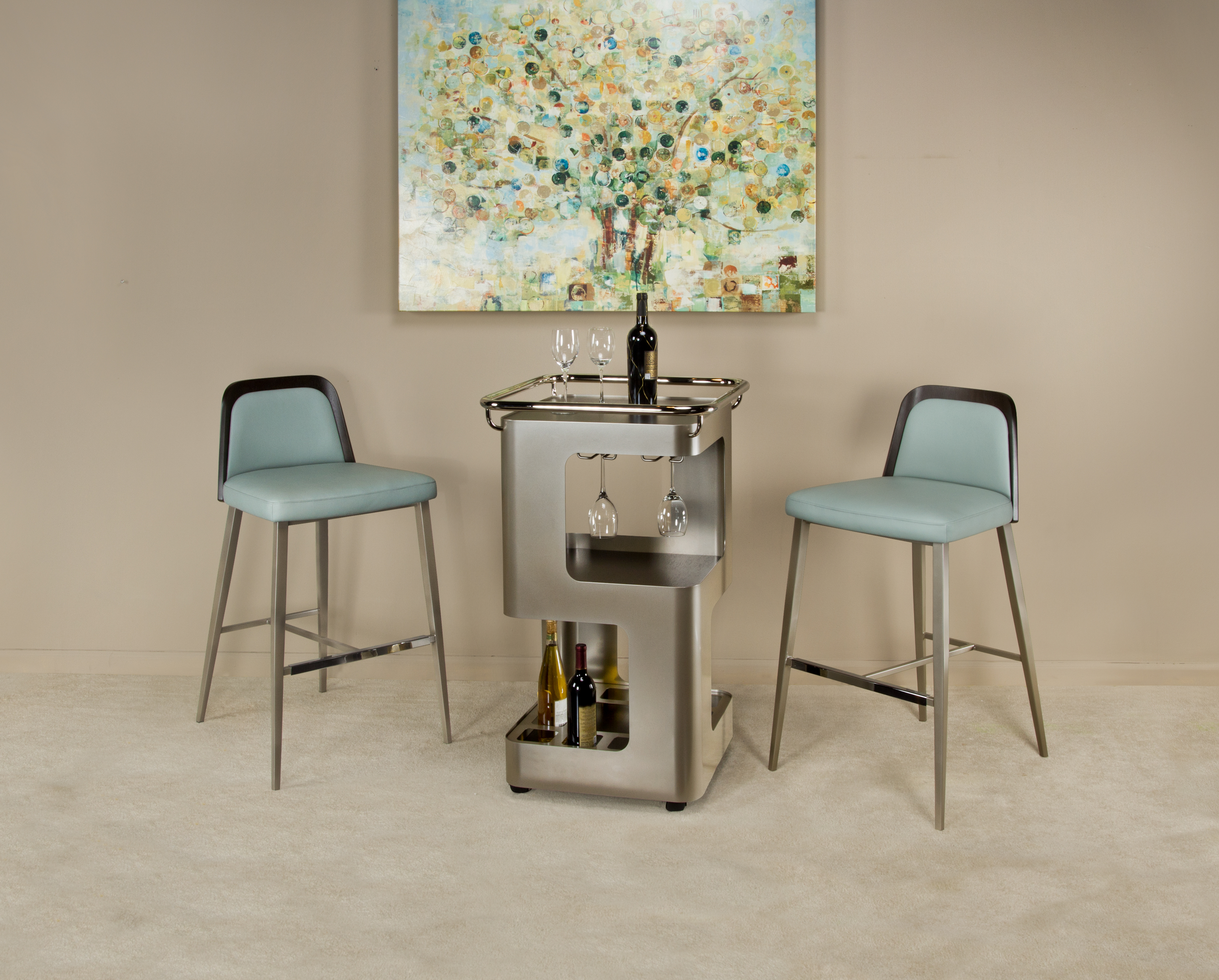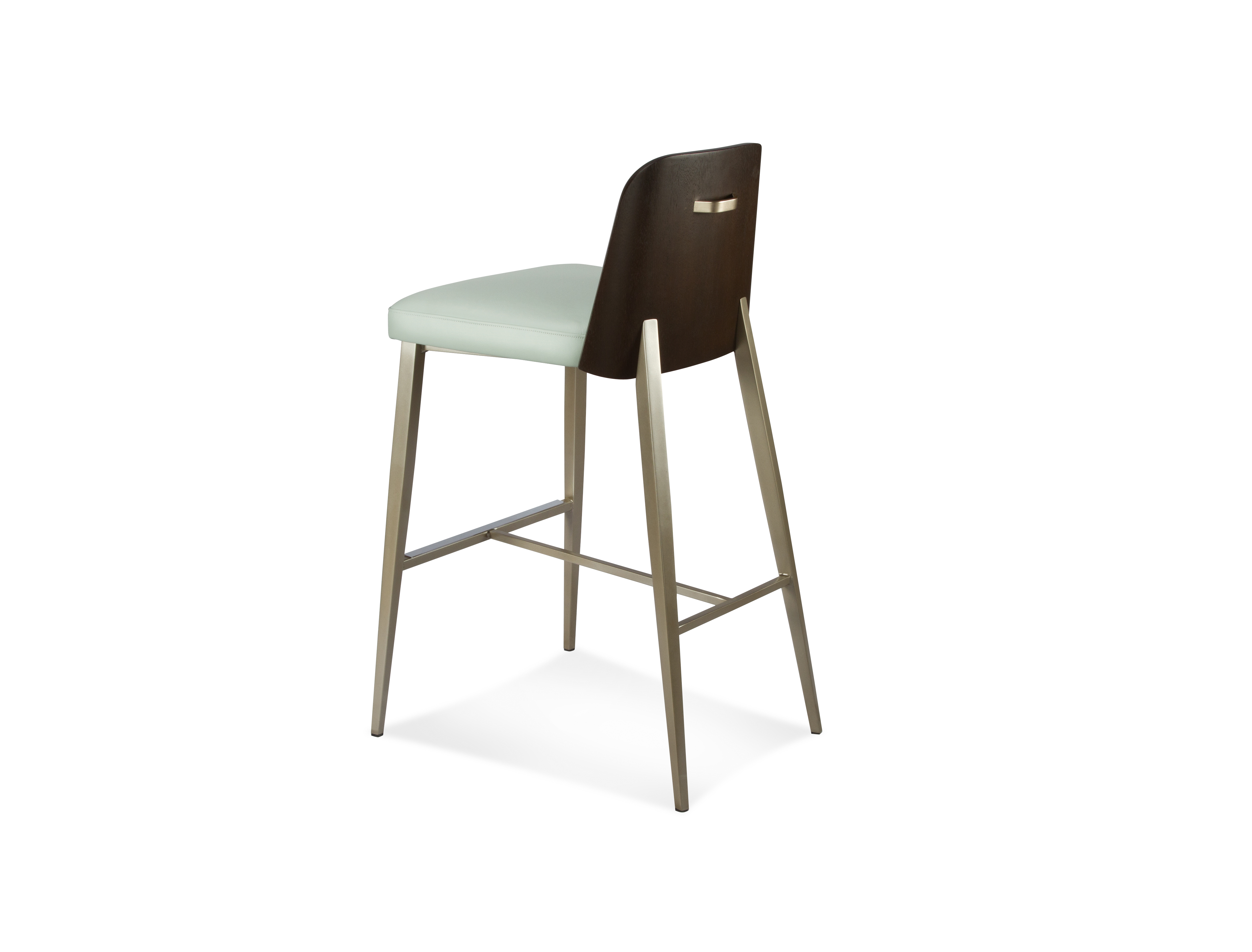 Coco brings a casual, fun presence to your dining and entertaining environments. Dramatically splayed and tapered steel legs give Coco a playful stance, and the rear legs rise to just kiss the bottom of the curved walnut veneer back. The softly radiused shoulders of the back surround a sleek upholstered panel, while cradling a generous seat cushion. There’s even a champagne handle to make Coco a little easier to handle, and a polished chrome footrest for just a little extra sparkle. Steel legs are available in all Elite powder-coat finishes, and walnut veneered back is offered in a variety of finishes. Coco will easily coordinate with many of our popular bars and pub tables. Companion dining chair also available.
