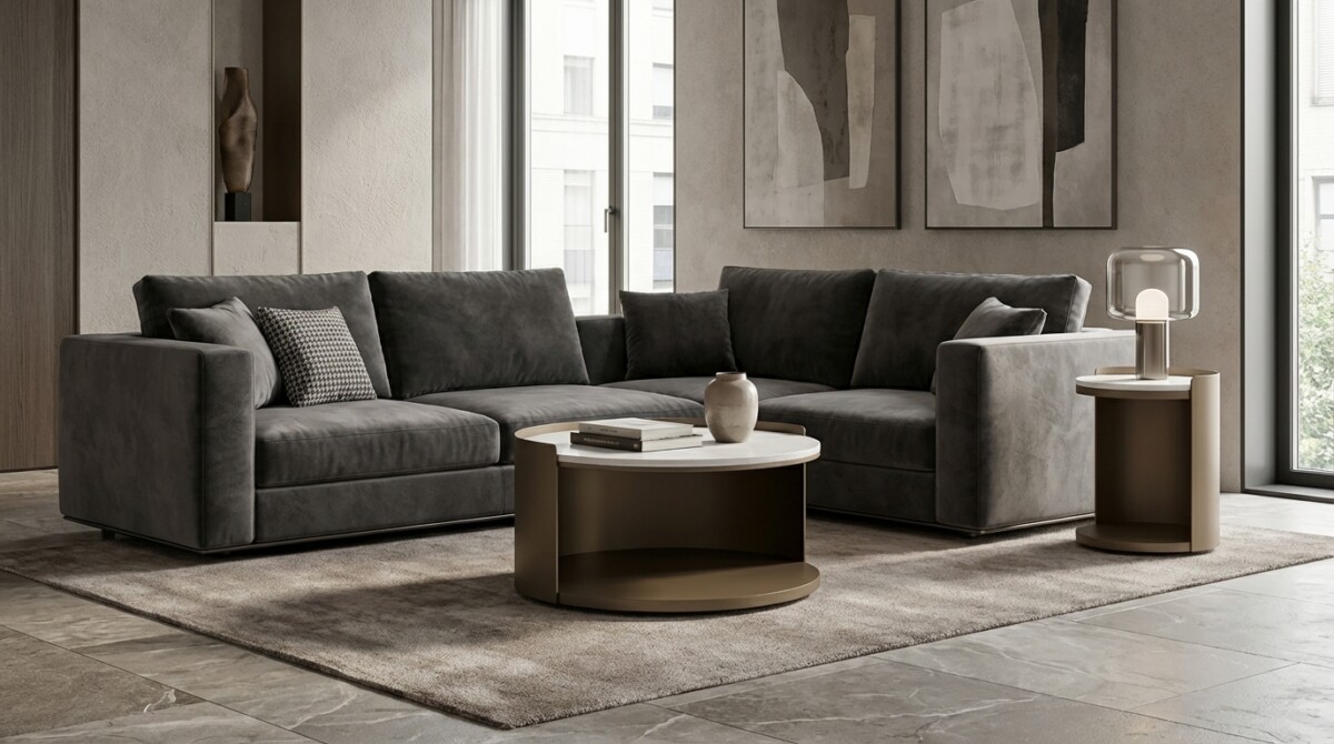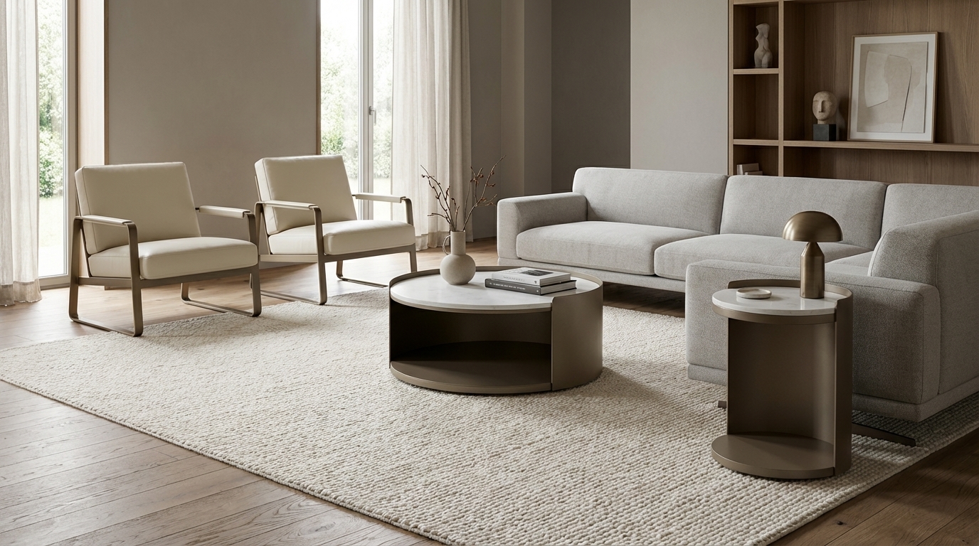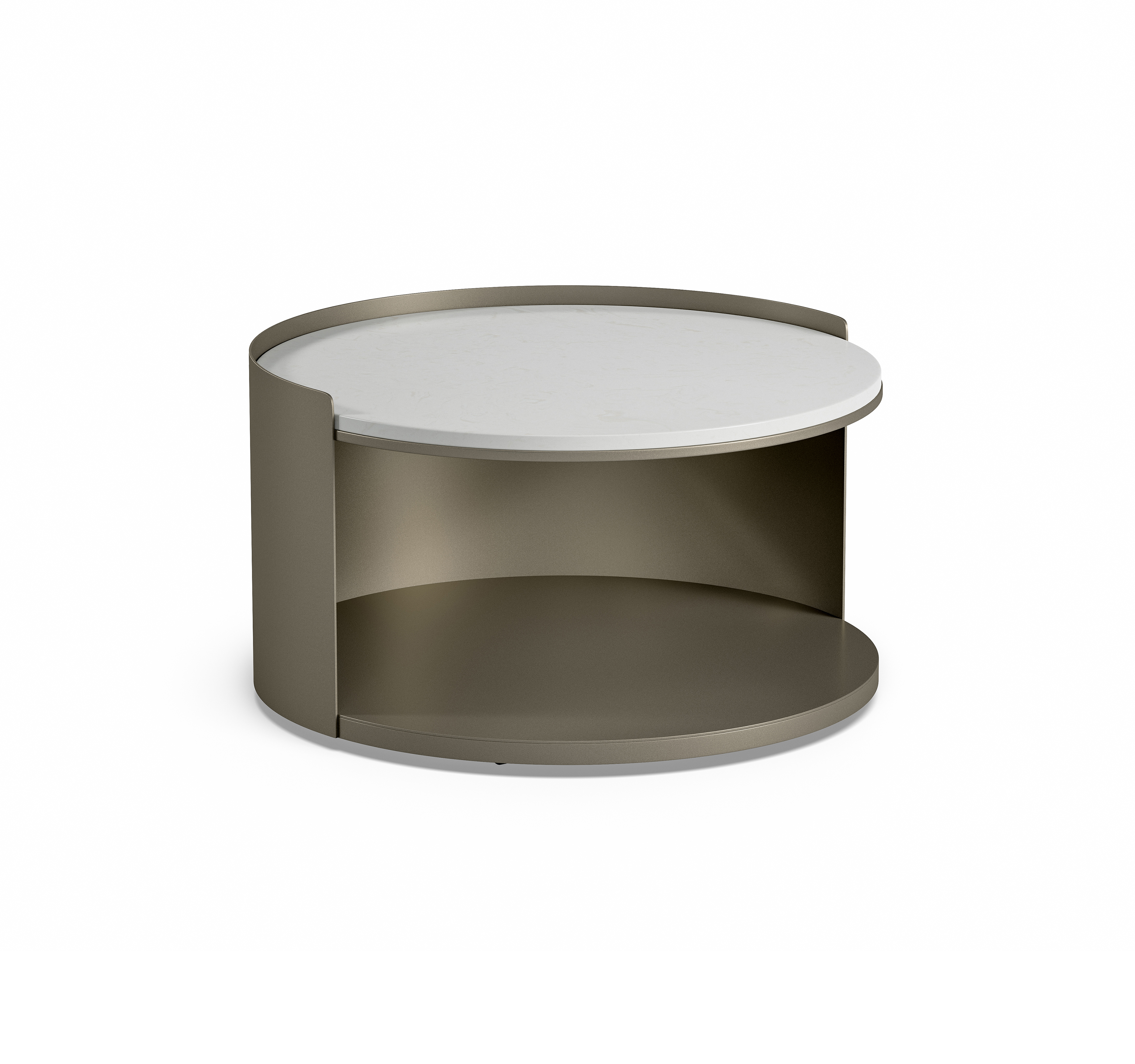 A curved steel panel with an oval opening wrap the round top of the Crescent cocktail table. The top is formed of cultured stone. Hidden casters allow the Crescent to be moved with ease.