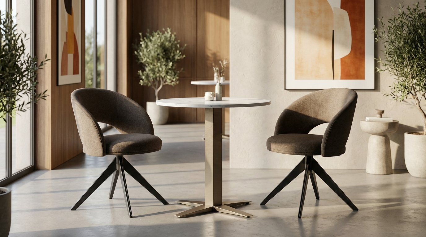 The Dana swivel dining chair is a masterpiece of contemporary design and unparalleled comfort. Crafted to elevate any sophisticated dining space, its gracefully curved fully upholstered back and seat cradle you in serene comfort. The base features a memory swivel that can be rotated any direction 360 degrees and still return to face forward.