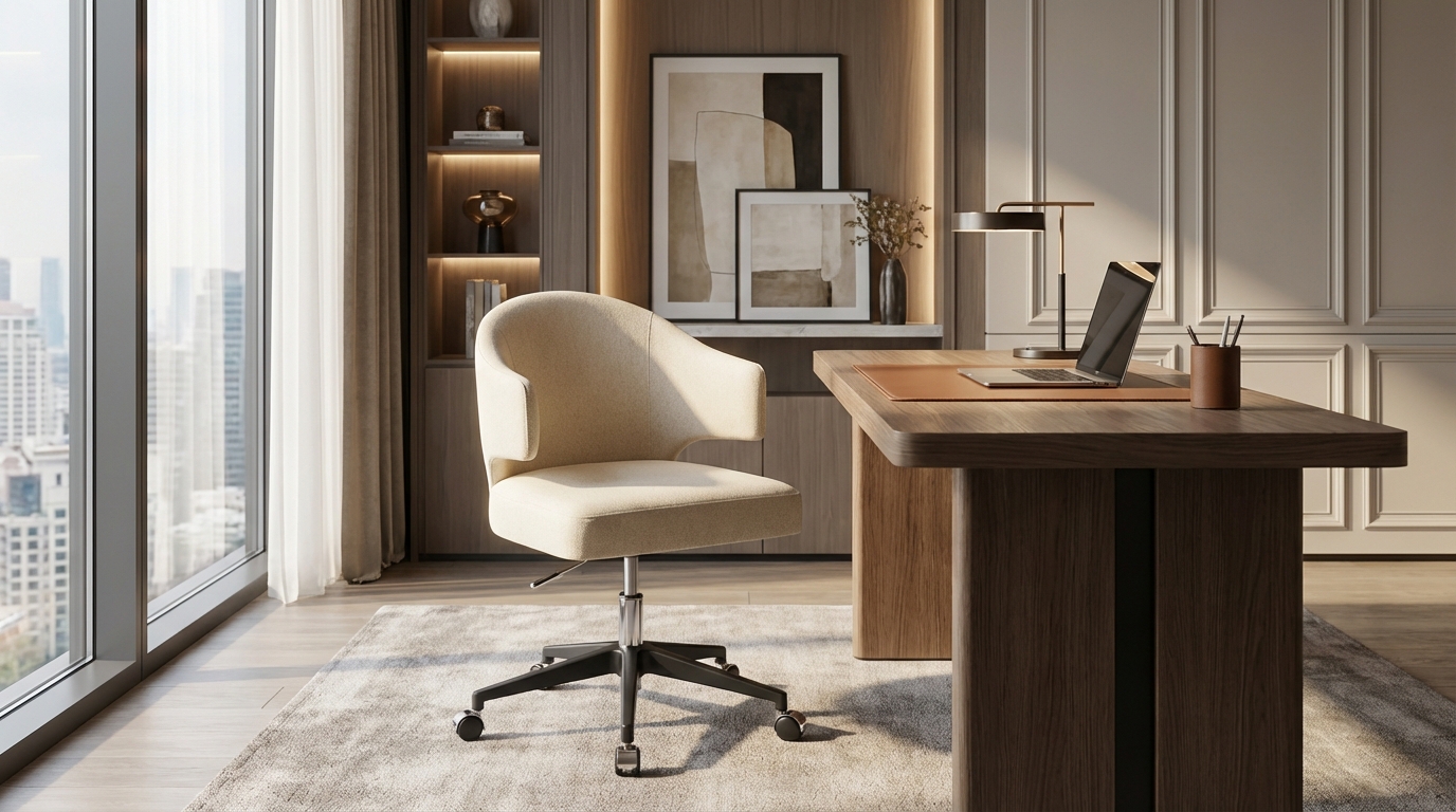 The Elliot desk chair epitomizes sophisticated modern design, blending ergonomic comfort with a sleek, minimalist aesthetic. Featuring a masterfully contoured, fully upholstered seat and backrest that seamlessly curves into integrated armrests, this chair provides an inviting and supportive seat for any professional setting. Its refined silhouette is complemented by a robust powder-coated metal frame and a five-star base with smooth-gliding casters. The base prong is available in polished aluminum or your choice of powder coat color. Engineered for versatility, the Elliot includes an adjustable seat height and a 360-degree swivel, ensuring both style and functionality in the contemporary workspace.
