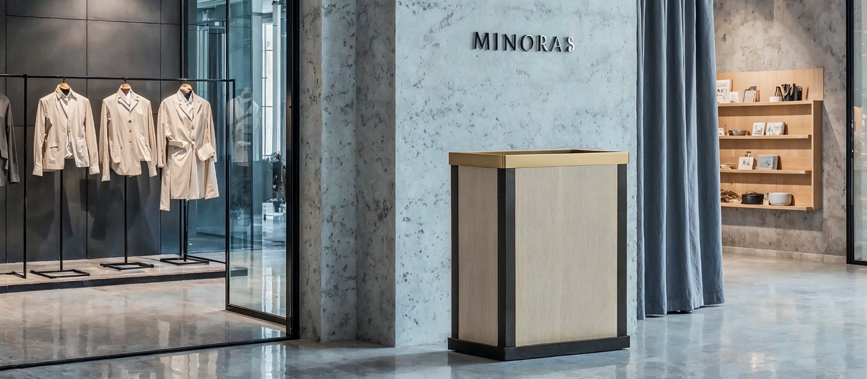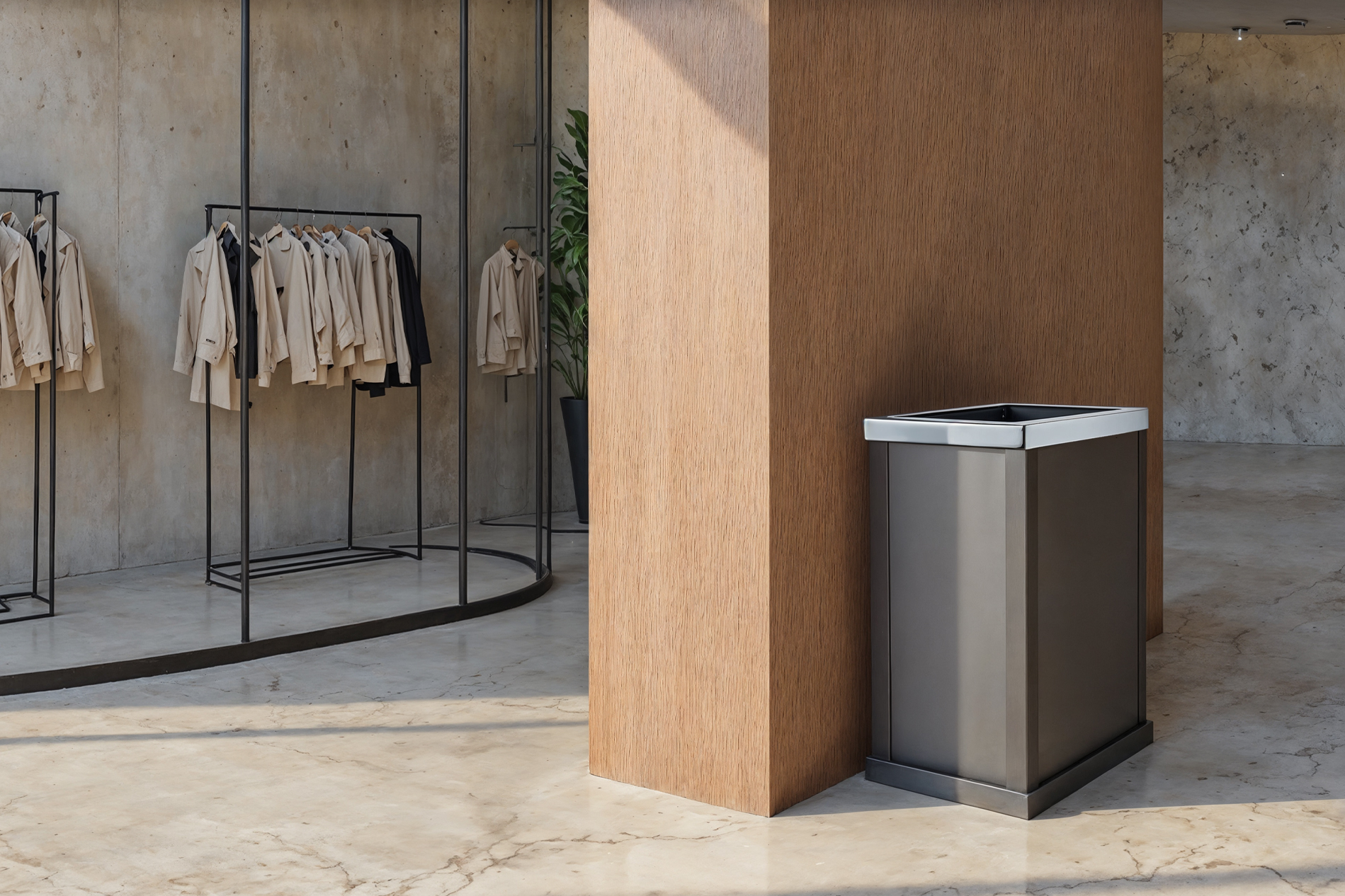 The Fillmore indoor commercial trash receptacle combines style and durability for hotels, offices, and hospitality spaces. Available in powder-coated steel or laminate finishes with customizable colors to fit any interior design.