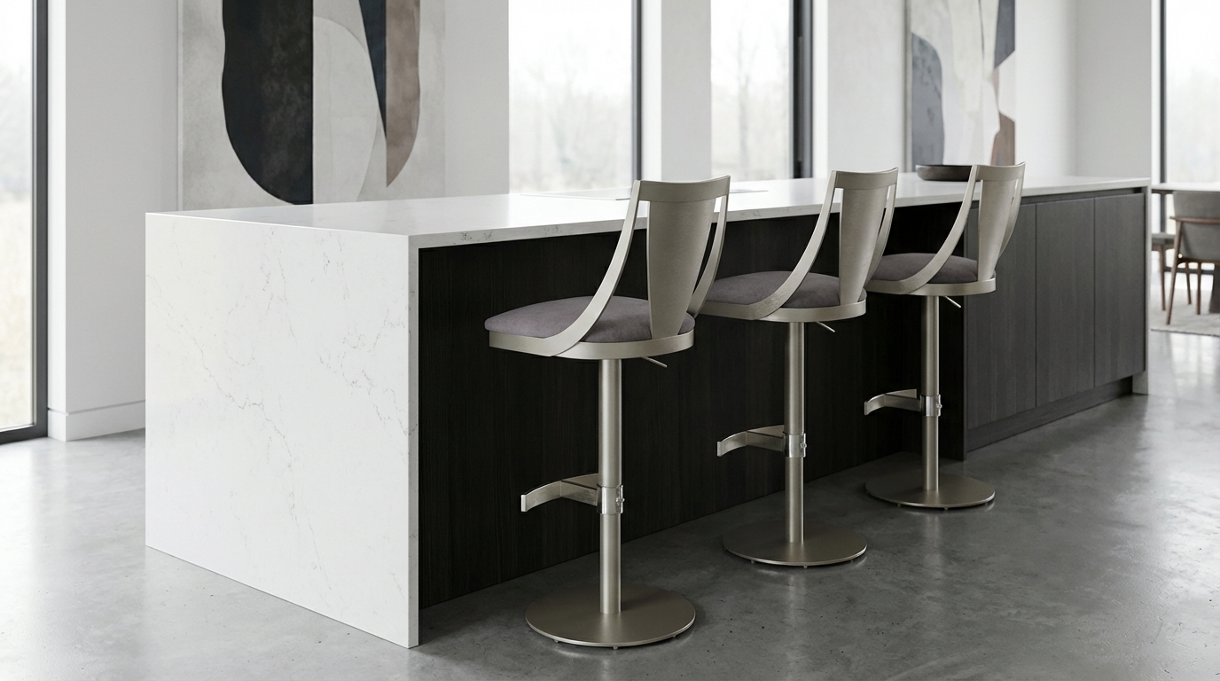 The Lana stool is shimmering, radiant, and charismatic. Curves flow into curves, while the Champagne-plated back melds seamlessly with the elegant lines of the frame. The Lana stool possesses a stately contemporary appeal. The hydraulic lift column easily adjusts from counter to bar height, or anywhere in between. Frame, column, and base are available in any Elite durable powder-coat finish, while the footrest is in Polished Chrome only.