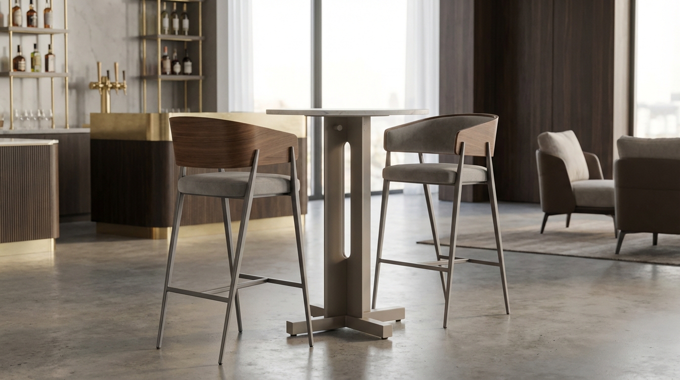Exuding a refined architectural elegance, the Luarca Bar Table is a masterclass in material harmony. This sophisticated piece rests upon a robust metal pedestal base. The central column, finished in a sleek powder coat, is defined by its signature oblong cutout and integrated accessory hooks, blending industrial strength with functional grace. Supported by a geometric four-point base with adjustable glides, this pub table is an ideal focal point for luxury hospitality settings or upscale modern interiors.