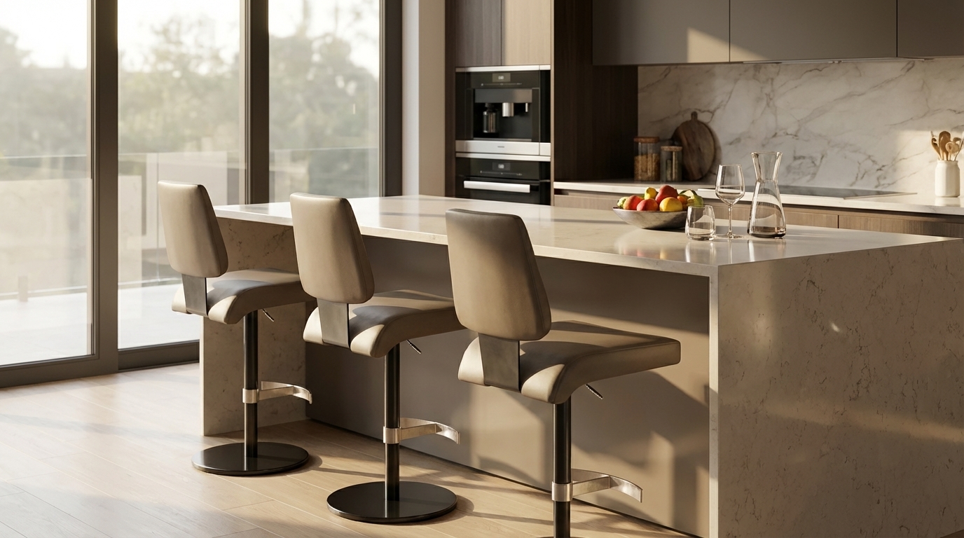 Magnum’s smooth contemporary styling and rich palette of materials enlivens this sleek adjustable swivel barstool. A sturdy champagne-plated bracket supports the plush upholstered backrest, which is offered either fully upholstered or with a rich walnut-veneered shell. The polished chrome footrest adds some extra sparkle. Magnum stools will easily coordinate with any of our popular bars or pub tables. Choose from any Elite fabric or leather to fit your decor. Steel base is available in all Elite powder-coat finishes, and walnut veneered back in a variety of finishes. Companion dining chair, bar and counter stools are also available