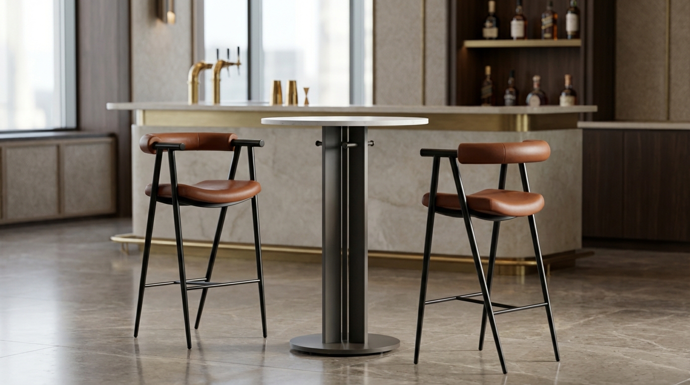 The Malaga pub table is a masterclass in modern architectural design, perfectly balancing high-end aesthetics with practical hospitality features. Its elegant circular top is supported by a striking tripod-style pedestal crafted from three powder-coated rectangular steel tubes. Designed for upscale lounges and contemporary social spaces, the table includes three integrated purse hooks for guest convenience and a sturdy circular base equipped with adjustable nylon glides for stability on any surface. This piece is a refined addition to any luxury interior, offering a clean, minimalist silhouette that exudes professional elegance.