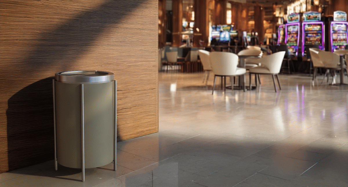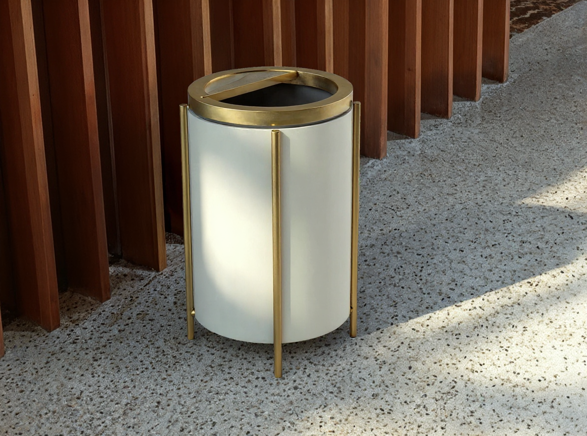 Metro round trashcan features a sleek metal frame with elegant vertical metal legs and a recessed top opening. Designed for dual functionality, it offers a lid with integrated sand insert for smokers in casino environments, or a clean single-opening option for hospitality and office settings. Available in a range of premium metal finishes, it delivers durability, sophistication, and adaptability for any space.
