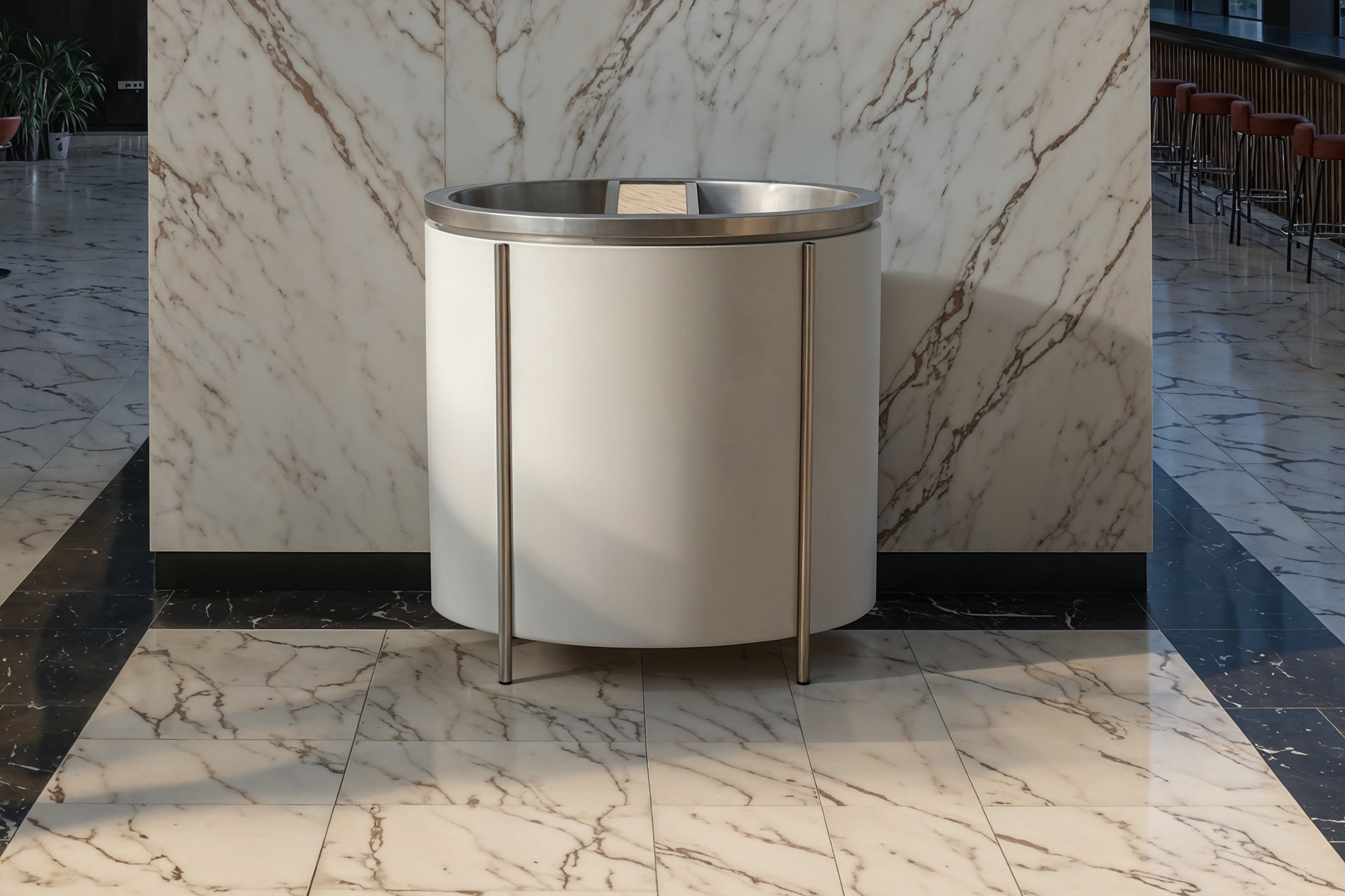 The Metro modern lobby waste bin blends contemporary style with practical functionality. Featuring dual compartments, a polished powder-coated finish, and refined metal accents, it’s ideal for hotels, offices, and upscale commercial spaces, providing both elegance and utility in high-traffic areas.