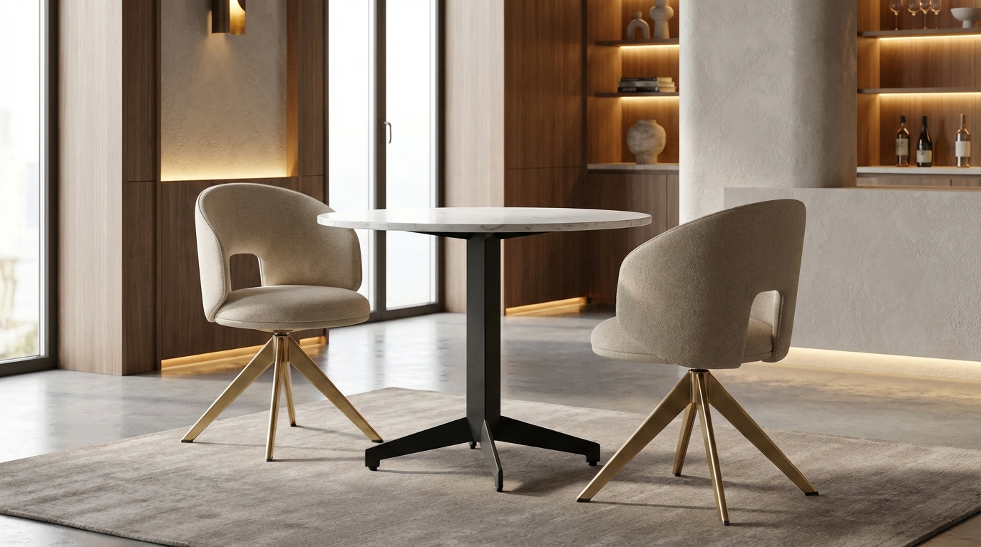 Exuding contemporary elegance, the Murcia dining table is a masterclass in material harmony. The table rests upon a minimalist tripod base crafted from powder-coated metal. The central square tube pedestal transitions into precise, angular metal legs, offering a light yet stable footprint. Equipped with adjustable glides, this table is a versatile statement piece perfectly suited for high-end bistros, lounges, or modern residential dining spaces.