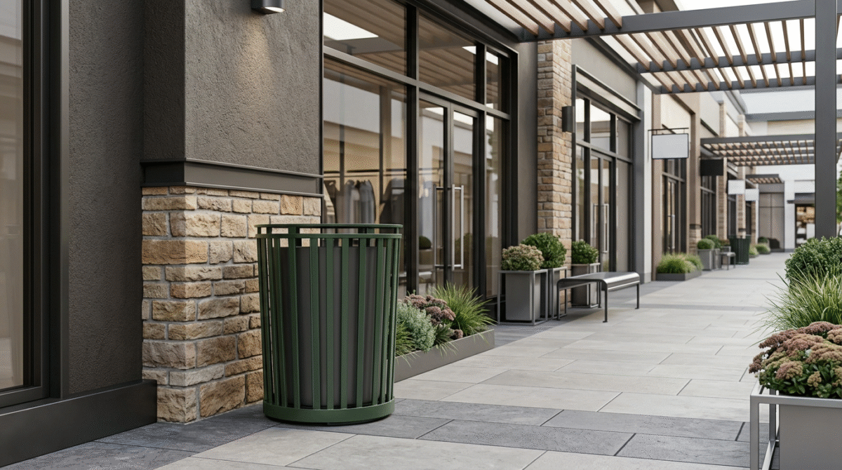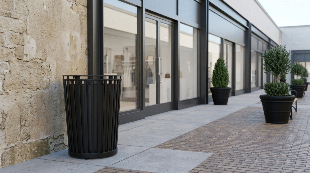 The Oval outdoor trash receptacle gets its name from it's oval shape.  The vertical tubes that surround the inner liner are oval.  A hinged lid, oval in shape, opens to reveal the lift out liner.  Customize the Oval with a powder coat color that complements your property.