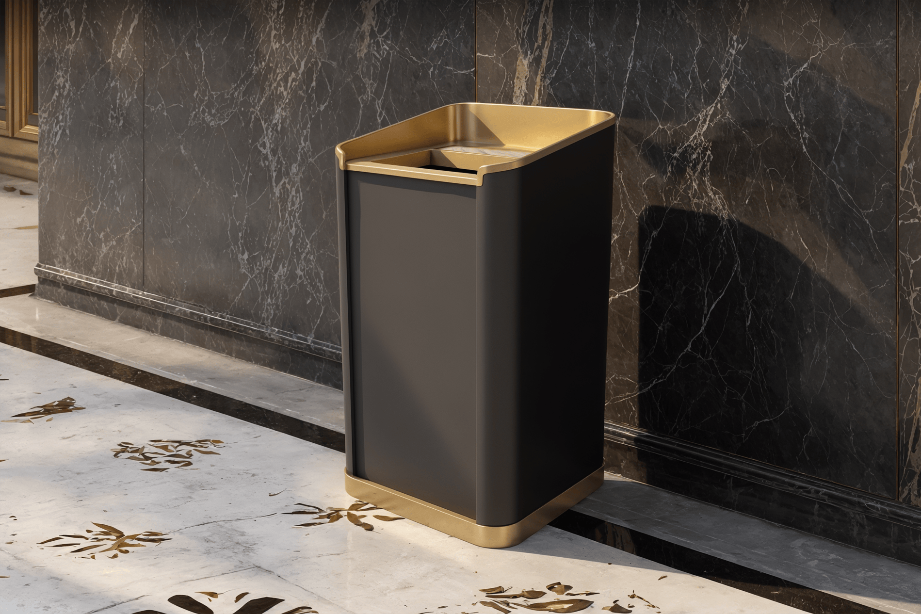 The Portola metal lobby trash can blends sleek geometric design with dual-compartment functionality, providing an elegant solution for trash and ash disposal. Ideal for luxury hotels, VIP lounges, and high-traffic commercial spaces, it keeps areas organized while enhancing the polished, contemporary atmosphere.