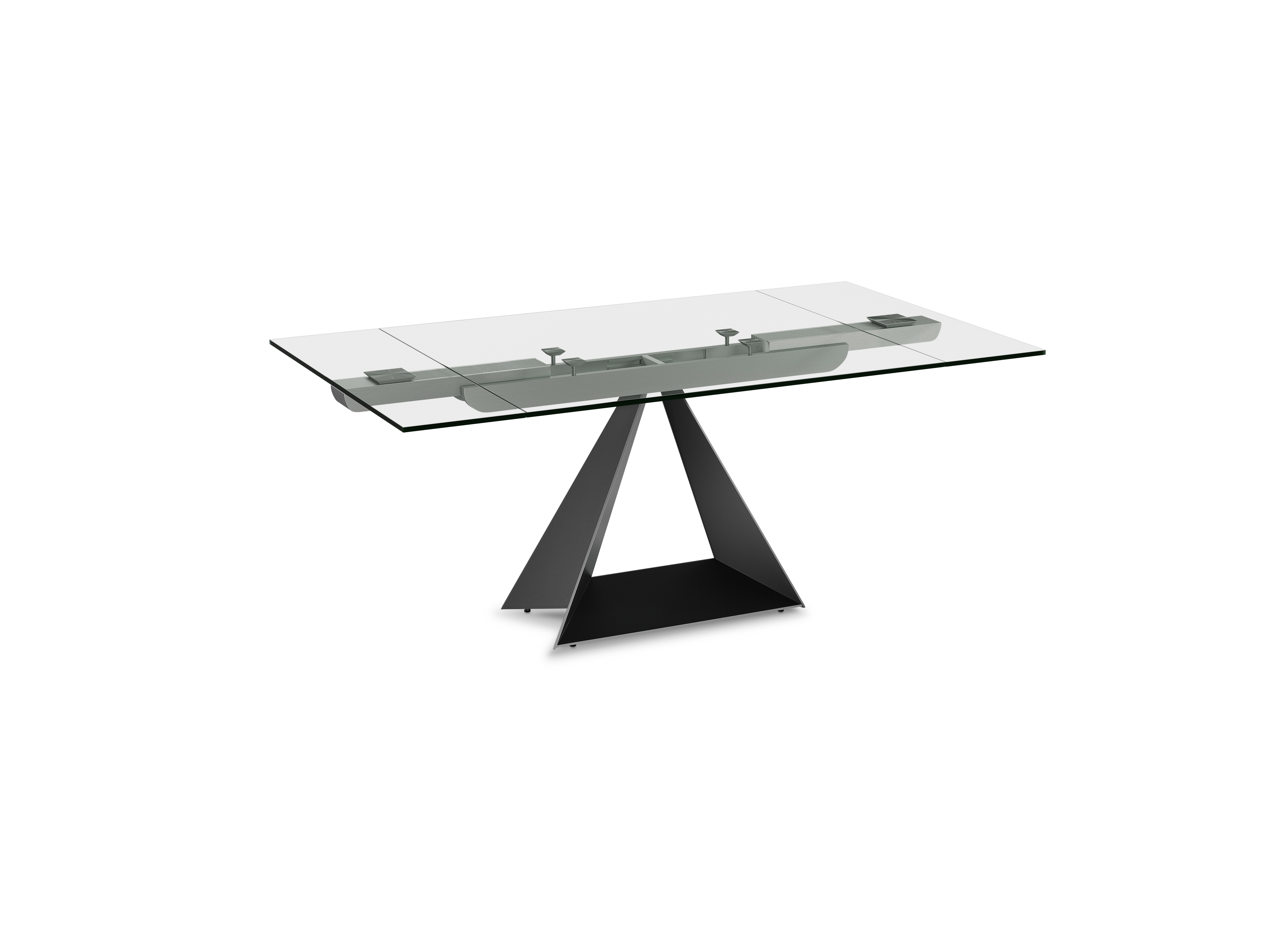 Unabashedly modern, the Prism design makes a bold singular statement. Angles abound, from the folded steel construction to the sleek geometric lines of the body. We have paired this striking silhouette with our proven extension mechanism for the utmost in ease, flexibility and strength. Our tempered glass table top fully reveals the beauty of the stunning base. Prism easily coordinates with any of our large selection of Elite Modern dining chairs.