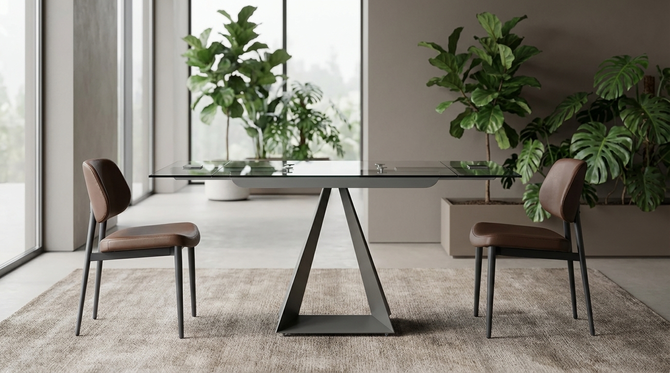 Unabashedly modern, the Prism design makes a bold singular statement. Angles abound, from the folded steel construction to the sleek geometric lines of the body. We have paired this striking silhouette with our proven extension mechanism for the utmost in ease, flexibility and strength. Our tempered glass table top fully reveals the beauty of the stunning base. Prism easily coordinates with any of our large selection of Elite Modern dining chairs.