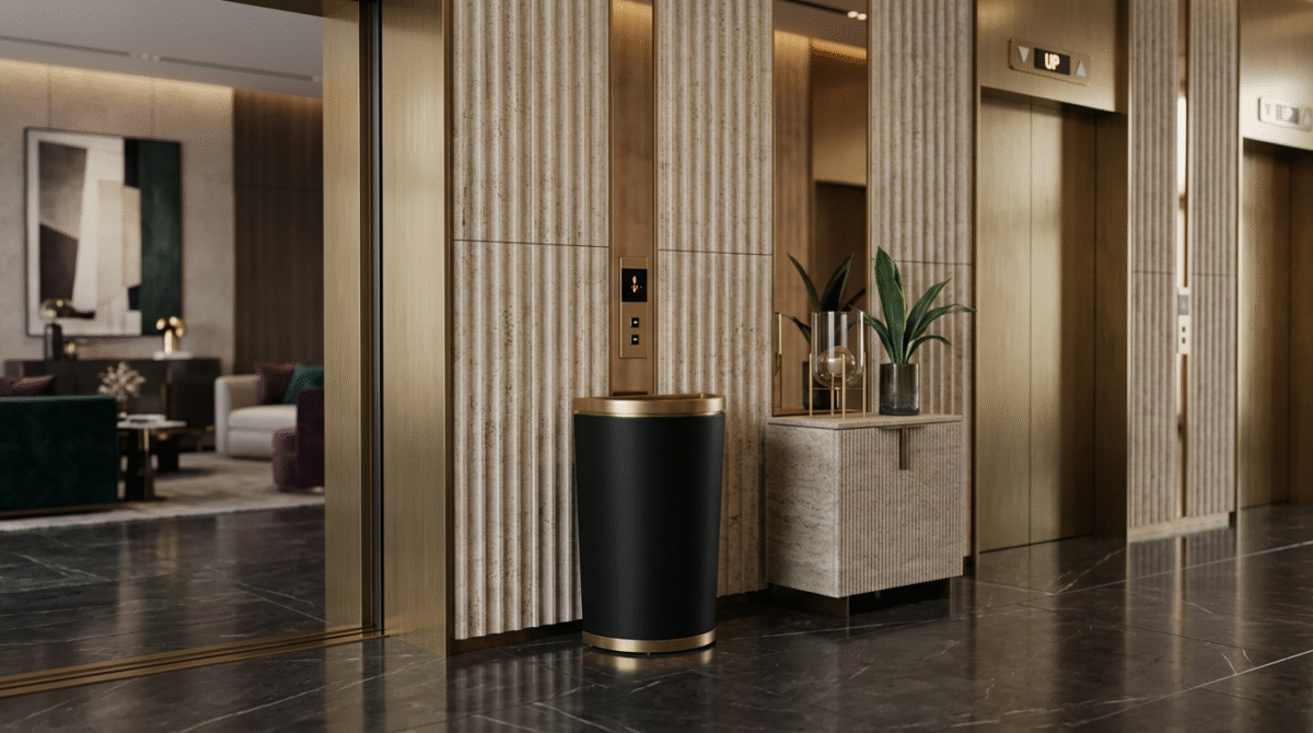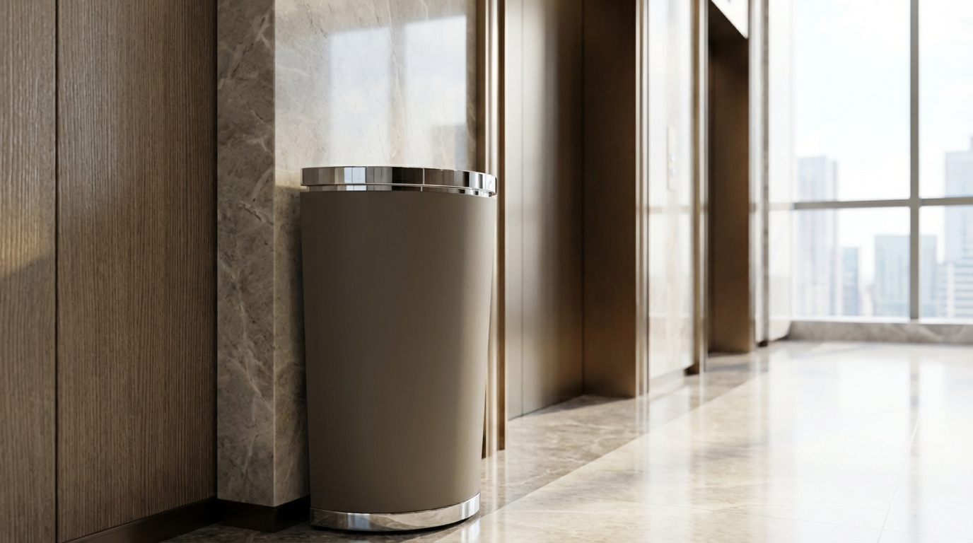 Pyramid features a tapered design where the top narrows gradually to the base. Upscale hotels and casino properties are the natural place for the modern design. A lift-off top directs the waste into the galvanized steel liner, which is removable. This top and the base trim is available in PVD brass or chrome. The main body of Pyramid comes in your choice of our Elite powder coat colors to fit your property style.