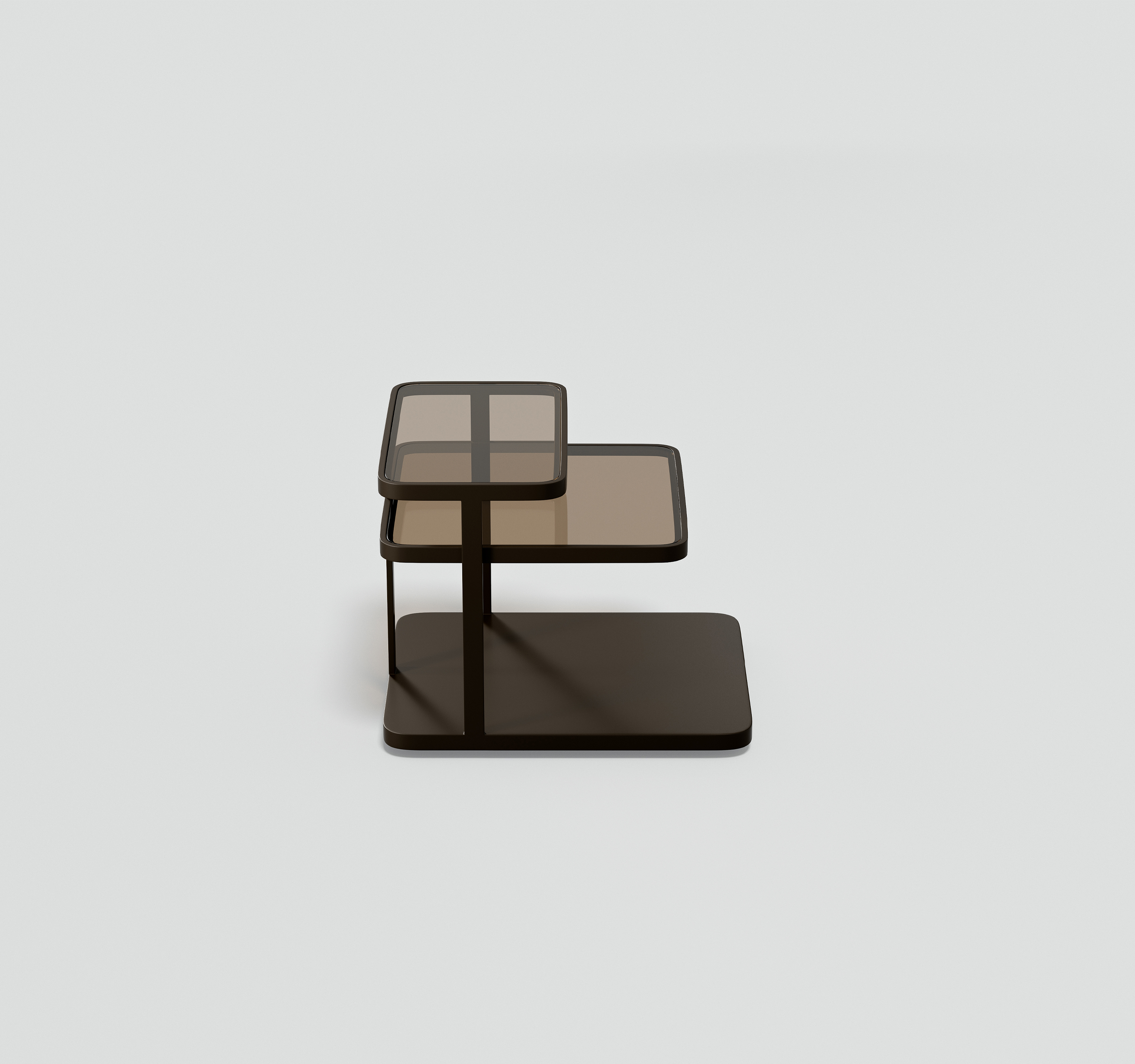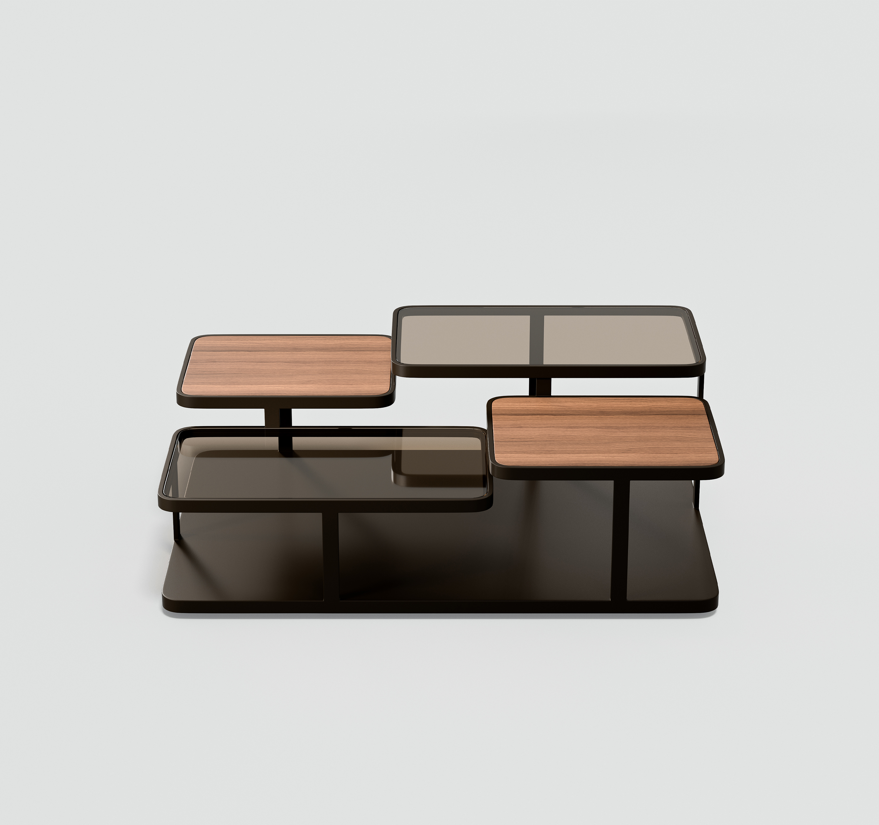 Quatro is a geometric coffee table with layered surfaces that offer a mix of textures and transparencies. Its contemporary design, featuring clean lines and a symmetrical structure, adds a sense of balance and harmony to any living space. The combination of materials adds depth and contrast, enhancing the table’s overall aesthetic appeal.