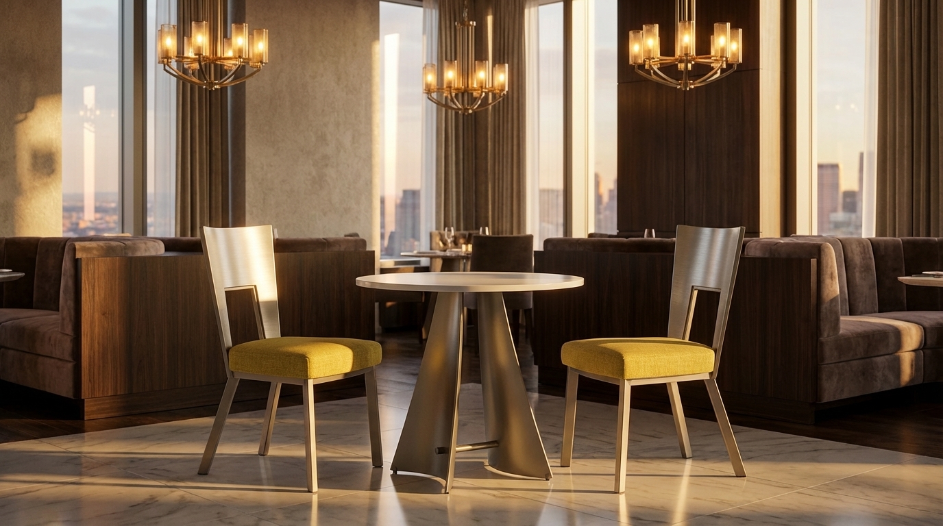 Our classic Regal chair is now available in a bistro size, perfect for today’s smaller urban spaces. The striking graphic cutout detail is still the central feature of this timeless design, and the shimmering, contoured champagne back and generous cushion still ensure long-term comfort. Choose from any Elite powder-coat finish, fabric, or leather to customize the Regal bistro chair to fit your decor.