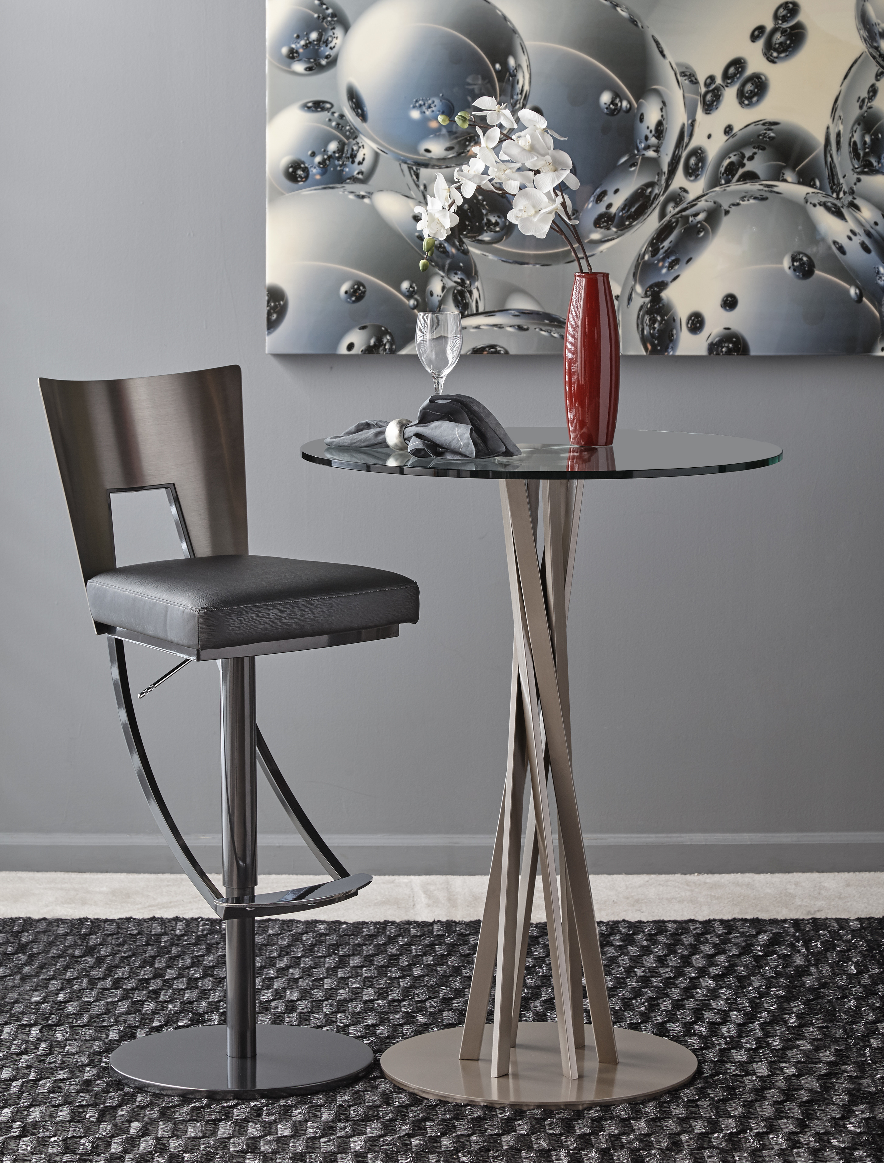 • The striking graphic cutout detail with metal frame supporting a contoured champagne-plated back