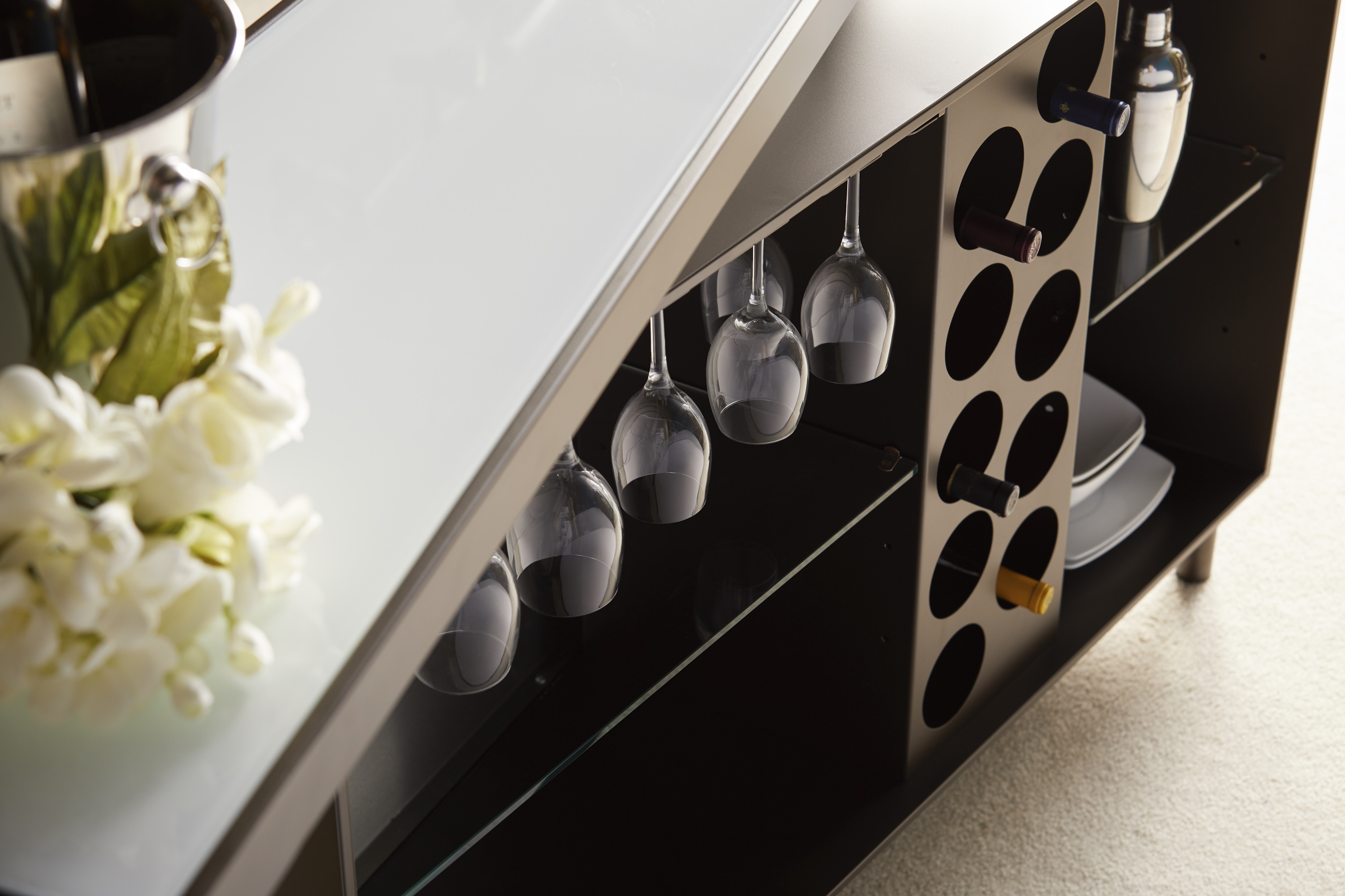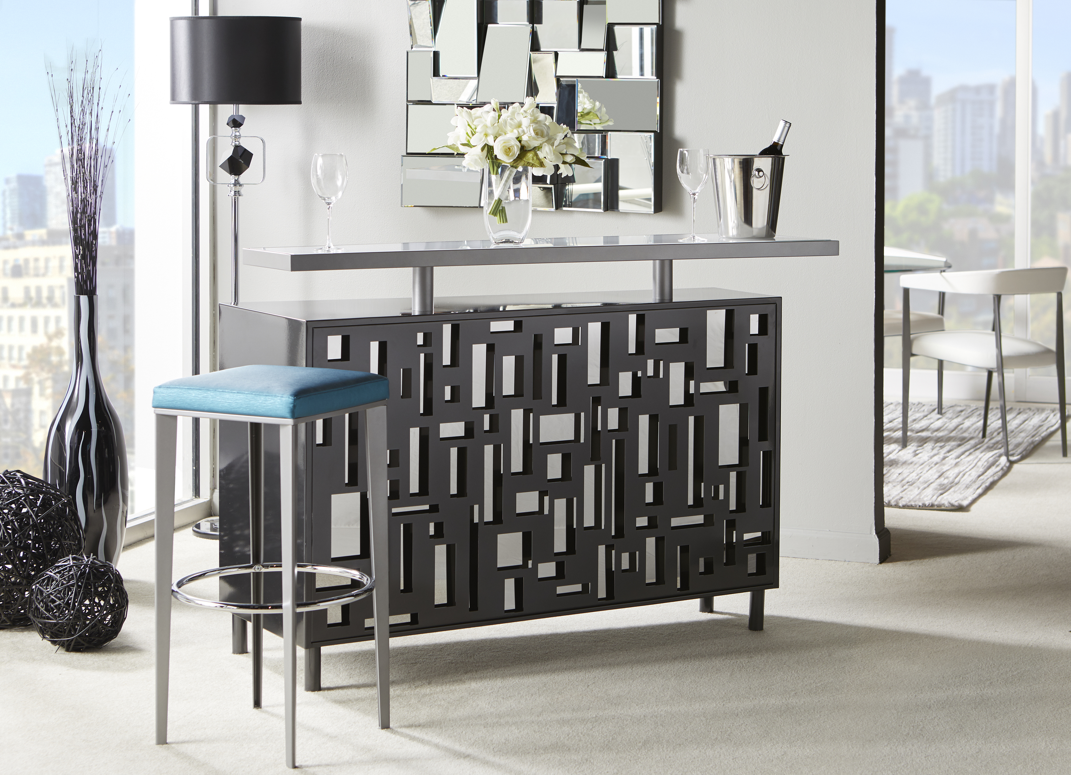 Sexy and stylish, the Skew bar features your choice of three laser-cut screens, dynamically skewed shapes, and a mirror panel for excitement and sparkle. Glossy white glass is inset into the trapezoidal bar top for both style and durability. The angled bar body features built-in bottle storage and two adjustable tempered glass shelves. You can mix-and-match any Elite powder-coat finish on the bar top and body. Choose between the Stones, Hex, or Array screen motif to complement your décor. This bar easily coordinates with any of our popular barstools. Let the Skew bar be the center of attention at your next party!