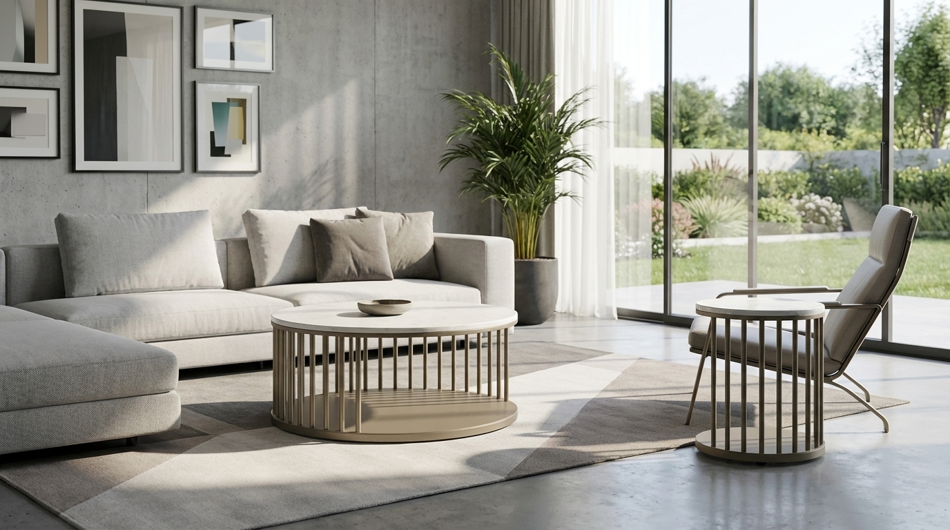 Whimsical and fun, the Spoke cocktail table has a round cultured stone top surface supported by a curved metal band. Additional upright spokes add strength and style. Hidden casters allow the Spoke to be moved with ease.