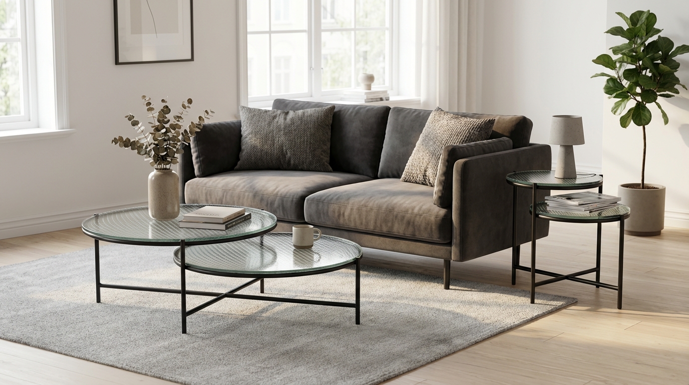 Two round glass tops are set on tubular support rings to create this simple yet stylish design. Custom choices include our powder coat colors for the welded steel base. Artistic fused glass, tinted shadow glass or one of each are the choices for the top surface.