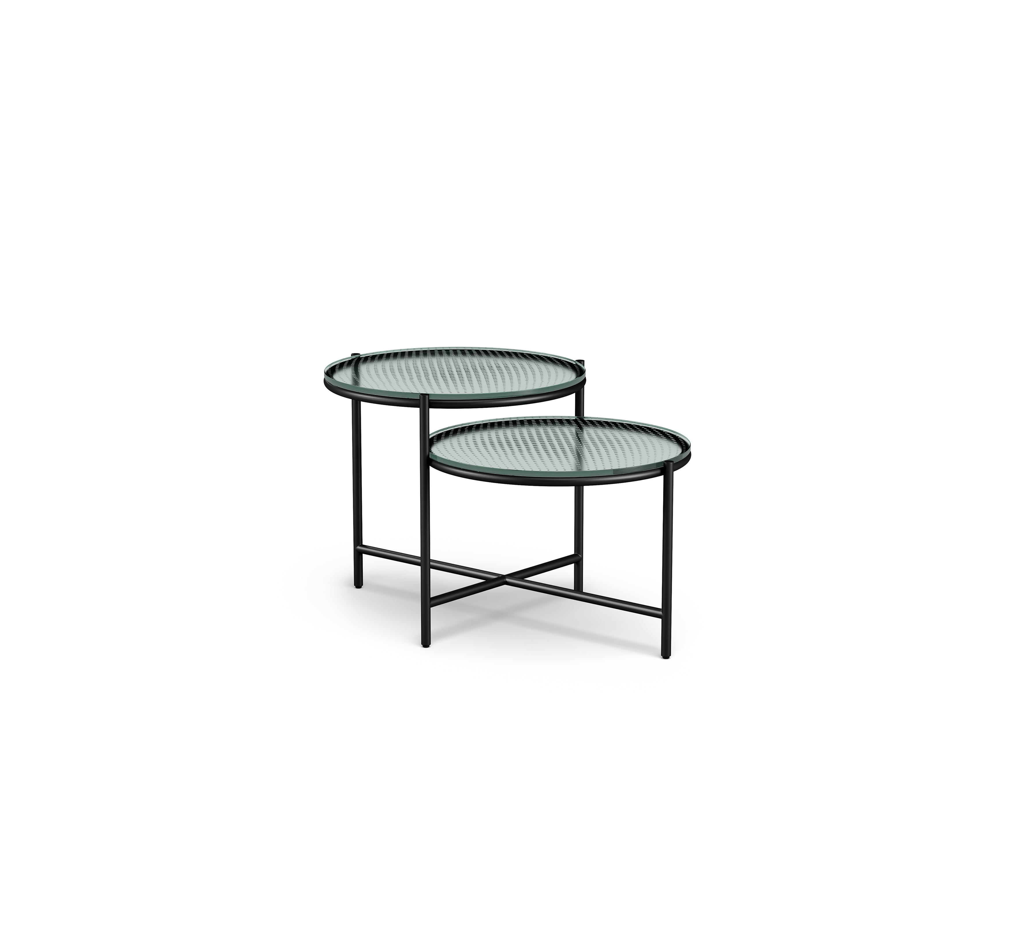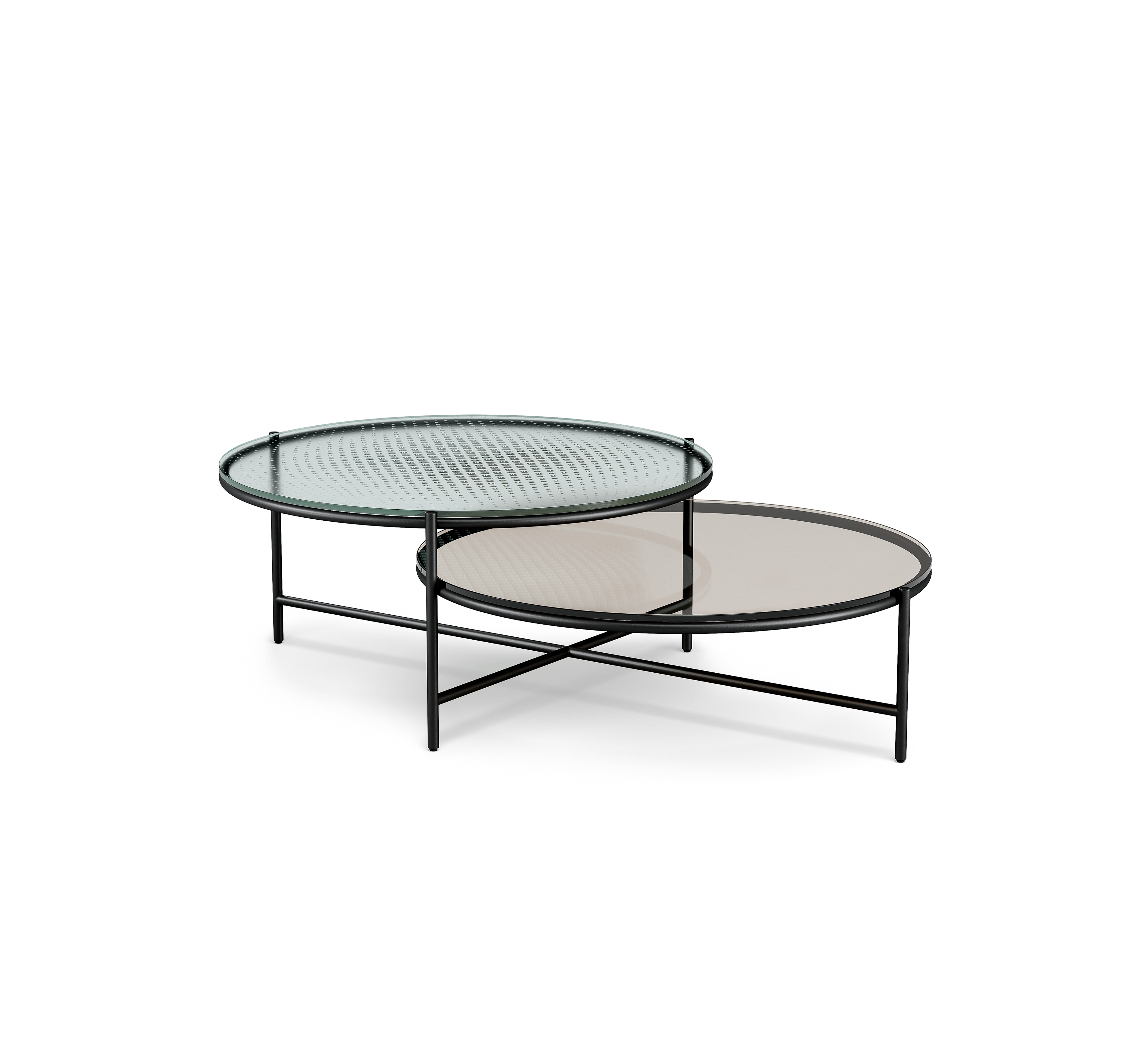 Two round glass tops are set on tubular support rings to create this simple yet stylish design. Custom choices include our powder coat colors for the welded steel base. Artistic fused glass, tinted shadow glass or one of each are the choices for the top surfaces.