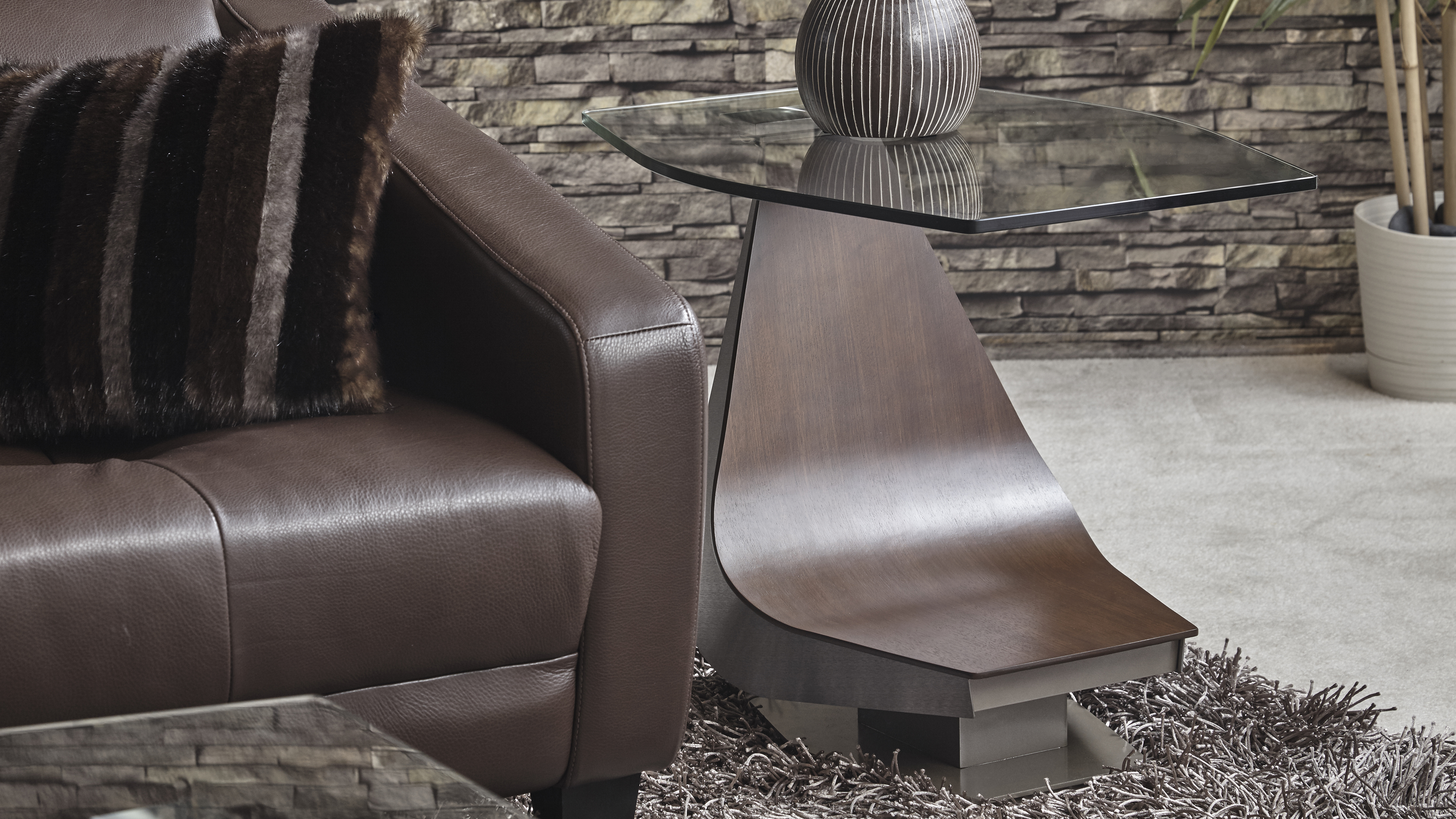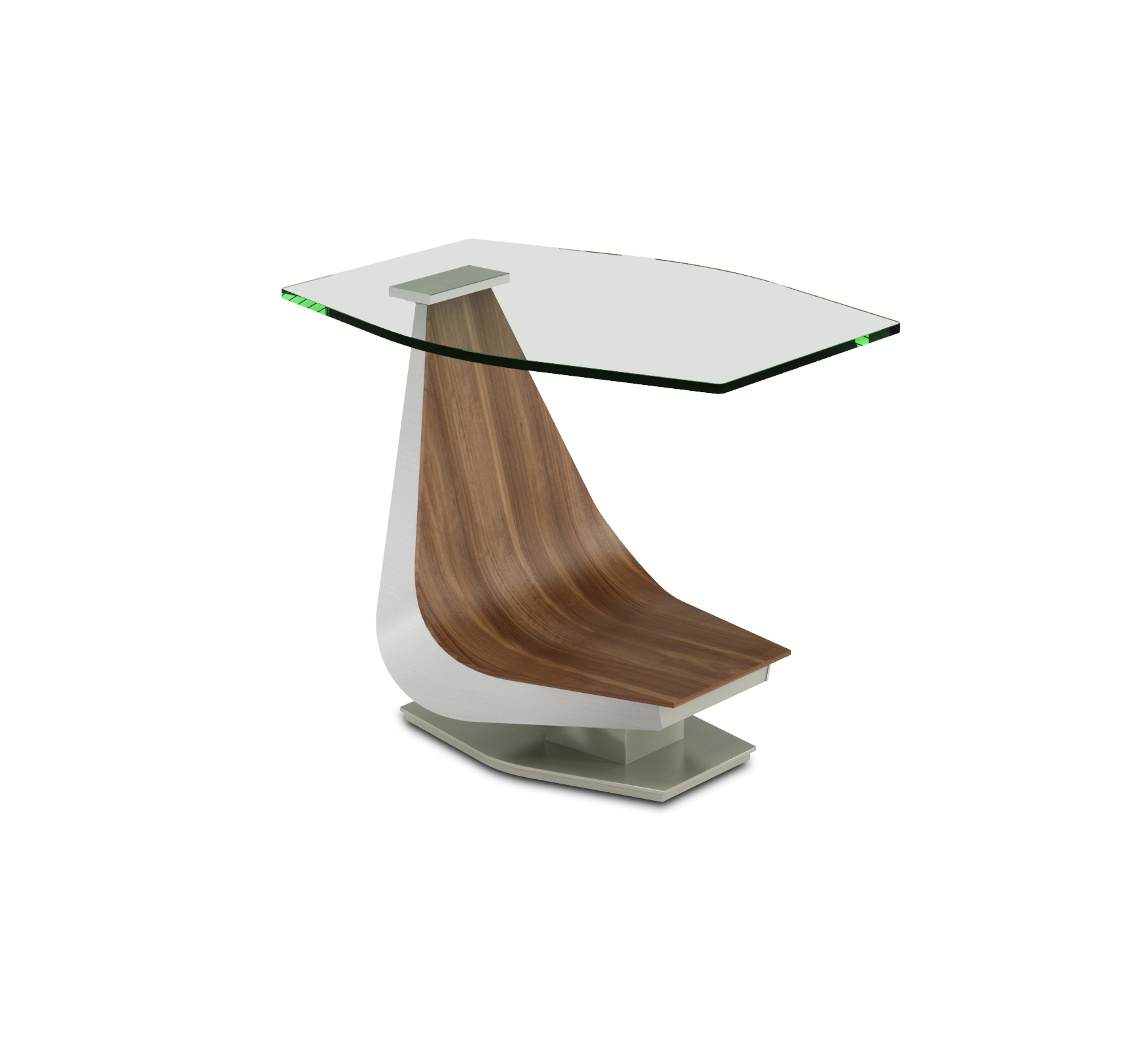 • Reverse hourglass-shaped, ½” thick tempered glass top is anchored and bonded by a stainless steel billet